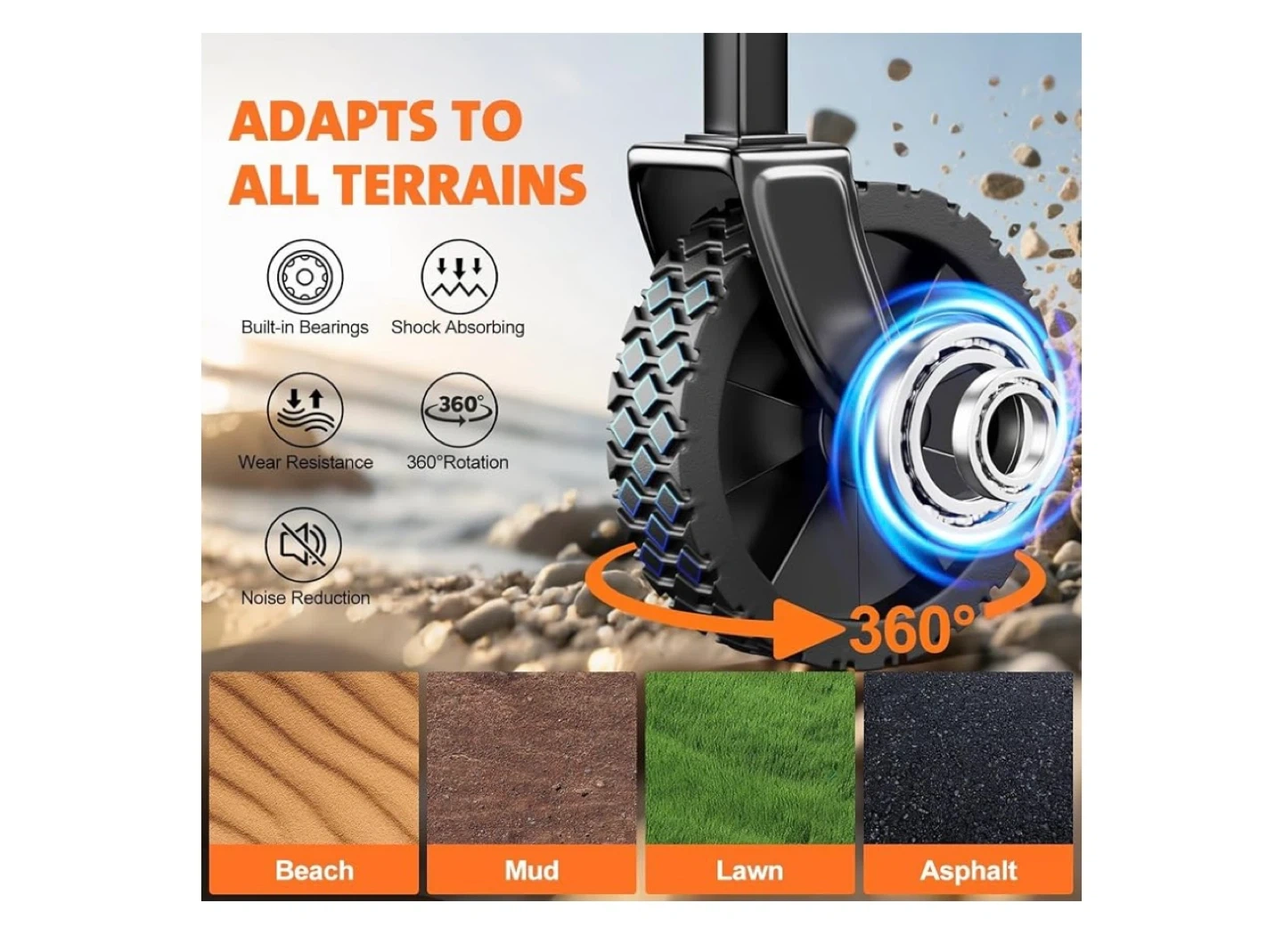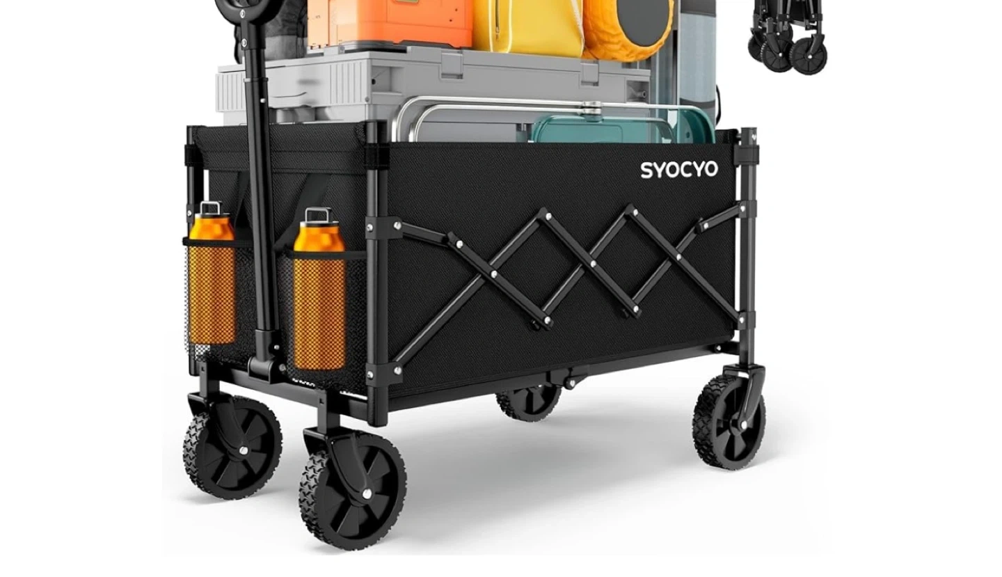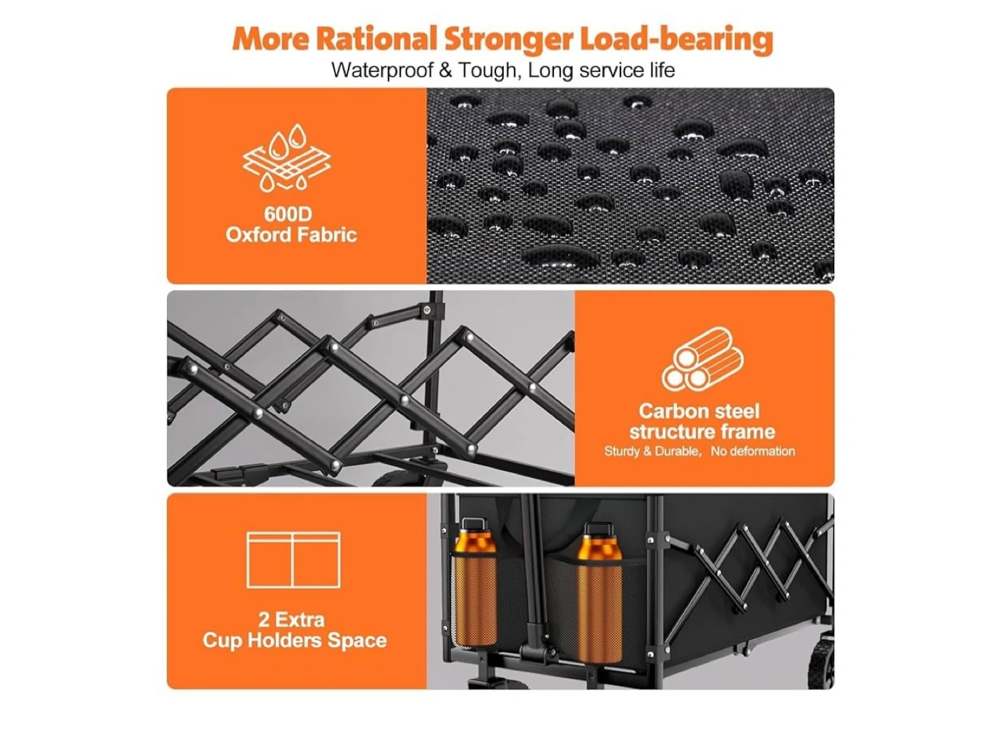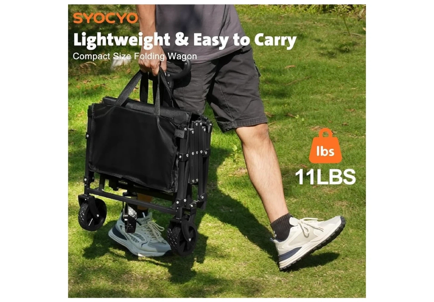 I'm selling a SYOCYO folding wagon cart in black! It's lightweight and easy to carry, folding into a compact size. It's designed to adapt to all terrains with built-in bearings and shock absorption. The wagon also features 360° rotation and noise reduction. Made with 600D Oxford fabric, it's waterproof and tough, ensuring a long service life. It also has a carbon steel structure frame, making it sturdy and durable. Plus, it includes 2 extra cup holders