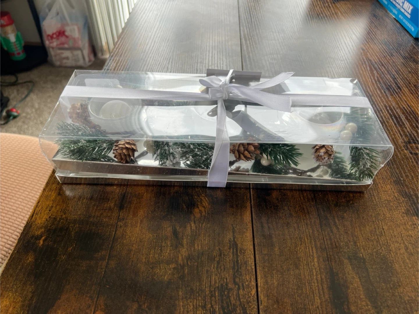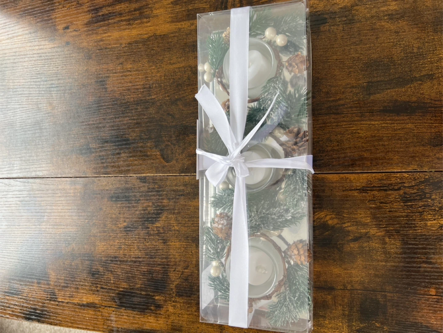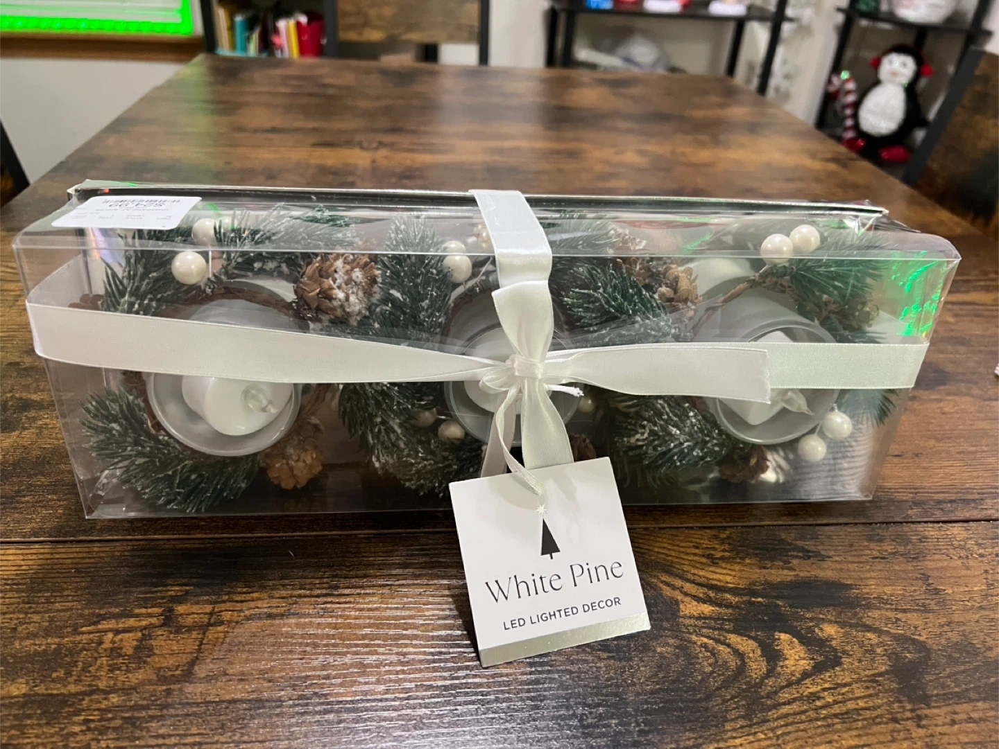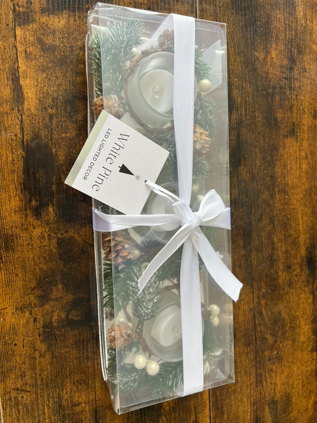 This set features LED lighted decor with a white pine design. It includes faux pine branches, pinecones, and white beads. Battery operated.brand new