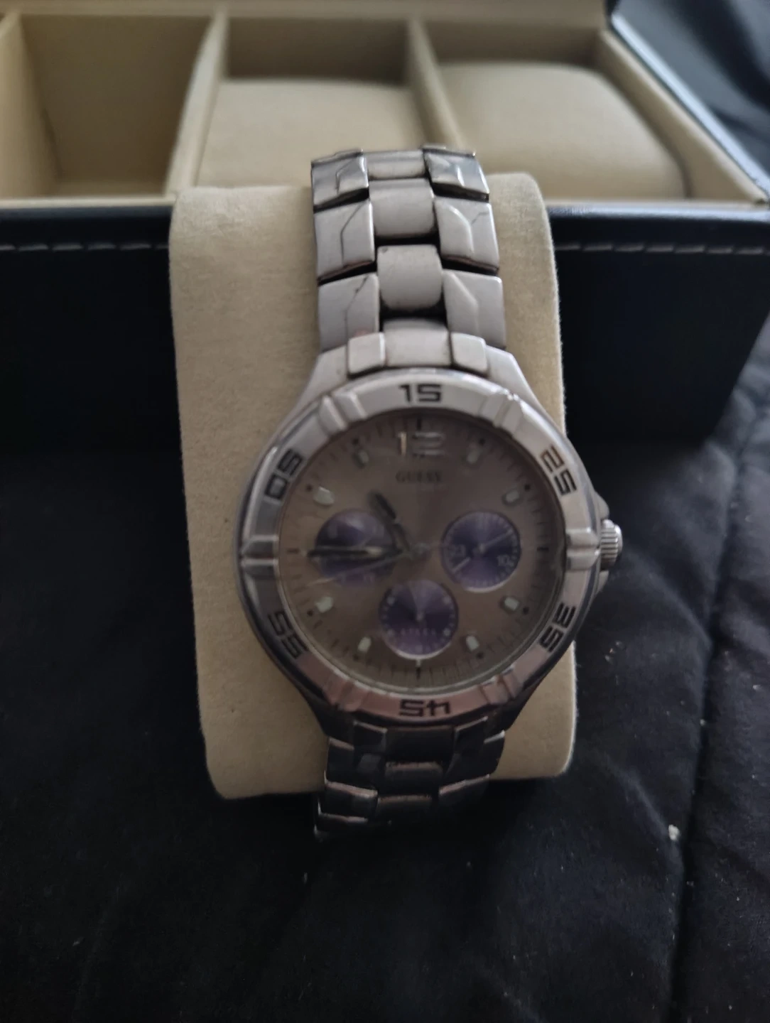 This is a Guess chronograph watch. It features a silver-tone metal band and a round dial with three sub-dials. The watch has a stainless steel case.