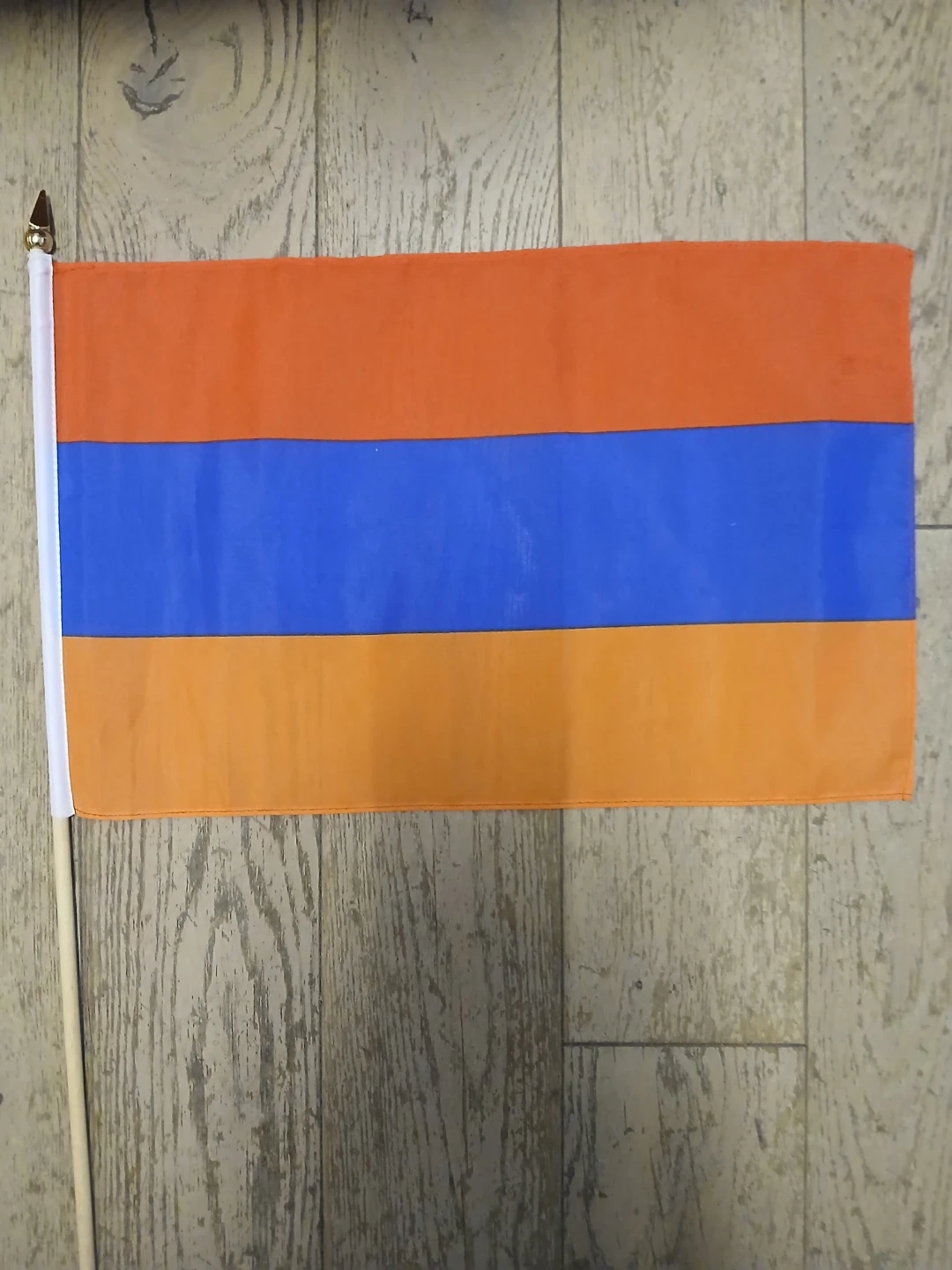 This is a handheld flag of Armenia. It has a horizontal tricolor design with red, blue, and orange stripes. The flag is attached to a wooden stick with a white fabric sleeve. Great for waving at events or displaying national pride!