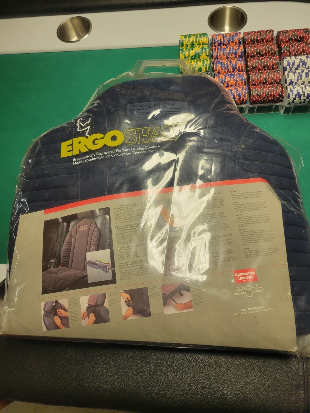 This is an Ergo Seat car seat cover for enhanced driving comfort. It's ergonomically engineered and designed for a comfortable driving experience. The cover is made from durable materials to last. This would be useful for anyone spending a lot of time driving.