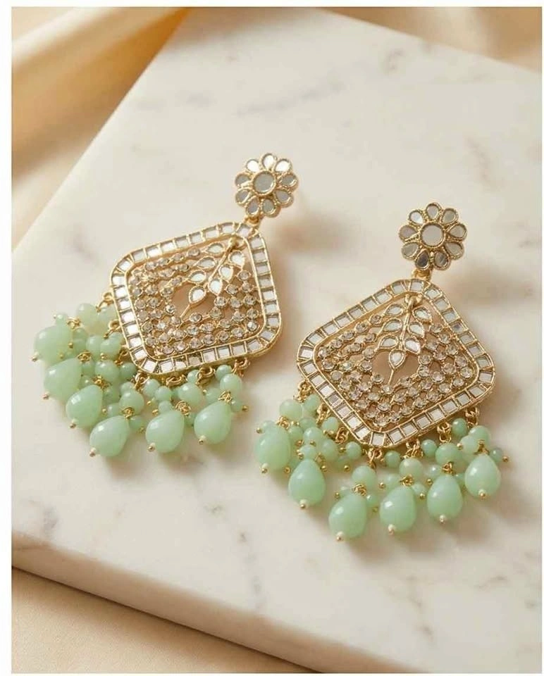 Beautiful gold-tone kundan earrings with soft mint green bead drops. Lightweight, elegant, and perfect for Eid, weddings, parties, and festive occasions. Premium detailing with mirror work and delicate hanging beads gives a classy and graceful look. Perfect for Indian & Pakistani outfits. Ideal for wedding guests or festive styling. Lightweight & comfortable to wear.