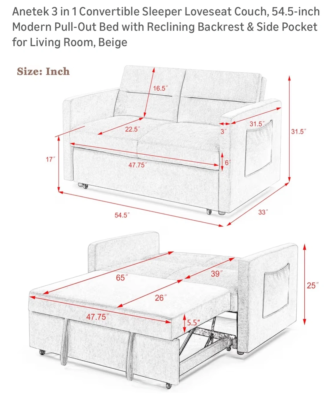 This Anetek loveseat couch converts into a sleeper with a 54.5-inch pull-out bed. It features a reclining backrest and a side pocket for storage. Upholstered in a beige fabric.