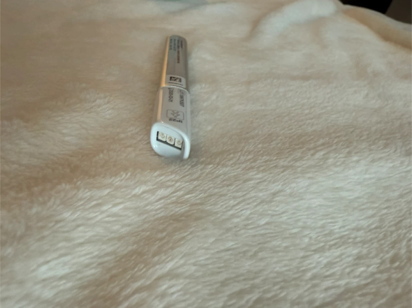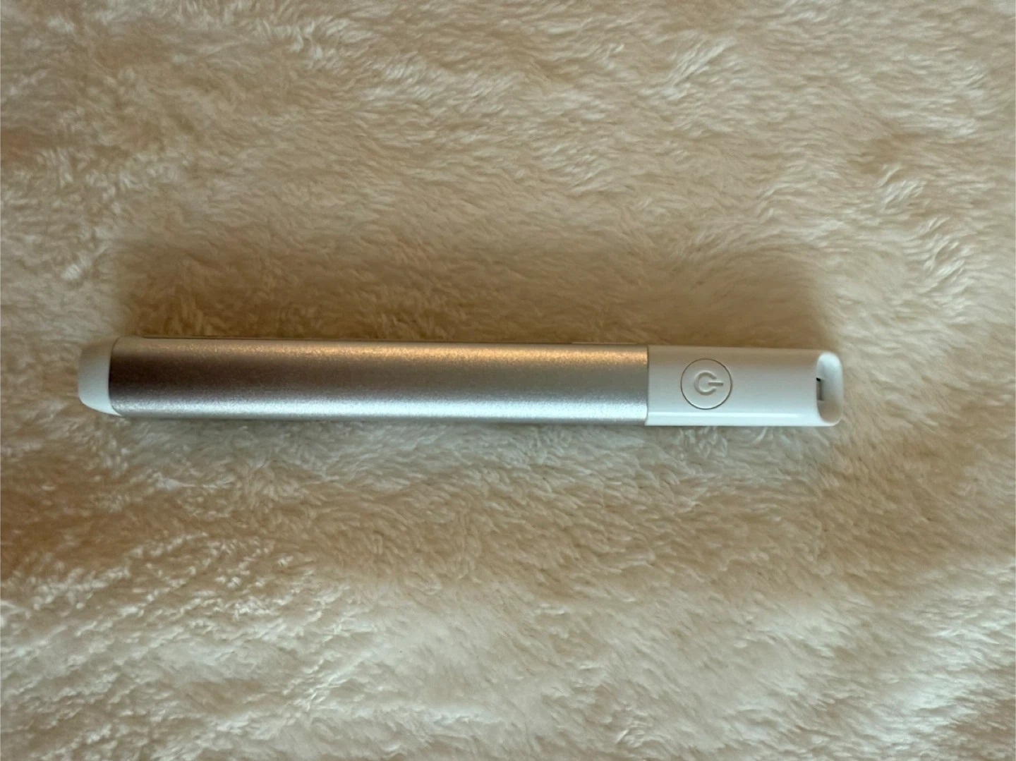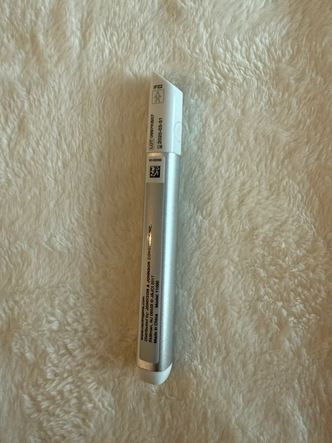 Neutrogena Light Therapy Acne Mask Wand. This device uses blue and red light therapy to treat acne. It's designed for easy at-home use. The wand itself is silver and white.