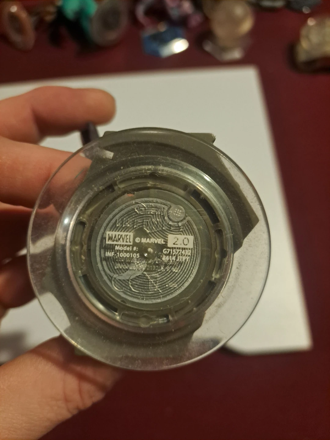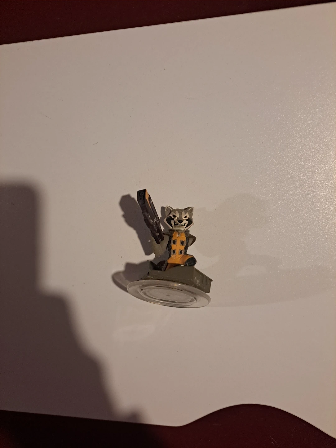 This is a Disney Infinity 2.0 Marvel Super Heroes Rocket Raccoon figure. It's part of the Marvel Super Heroes playset. The figure is made of plastic and features Rocket Raccoon in his signature outfit.