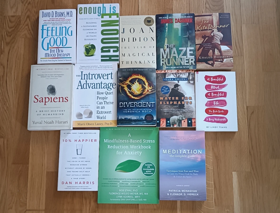 - '10% Happier' by Dan Harris, - 'Mindfulness-Based Stress Reduction Workbook for Anxiety' by Bob Stahl, Florence Meleo-Meyer & Lynn Koerbel