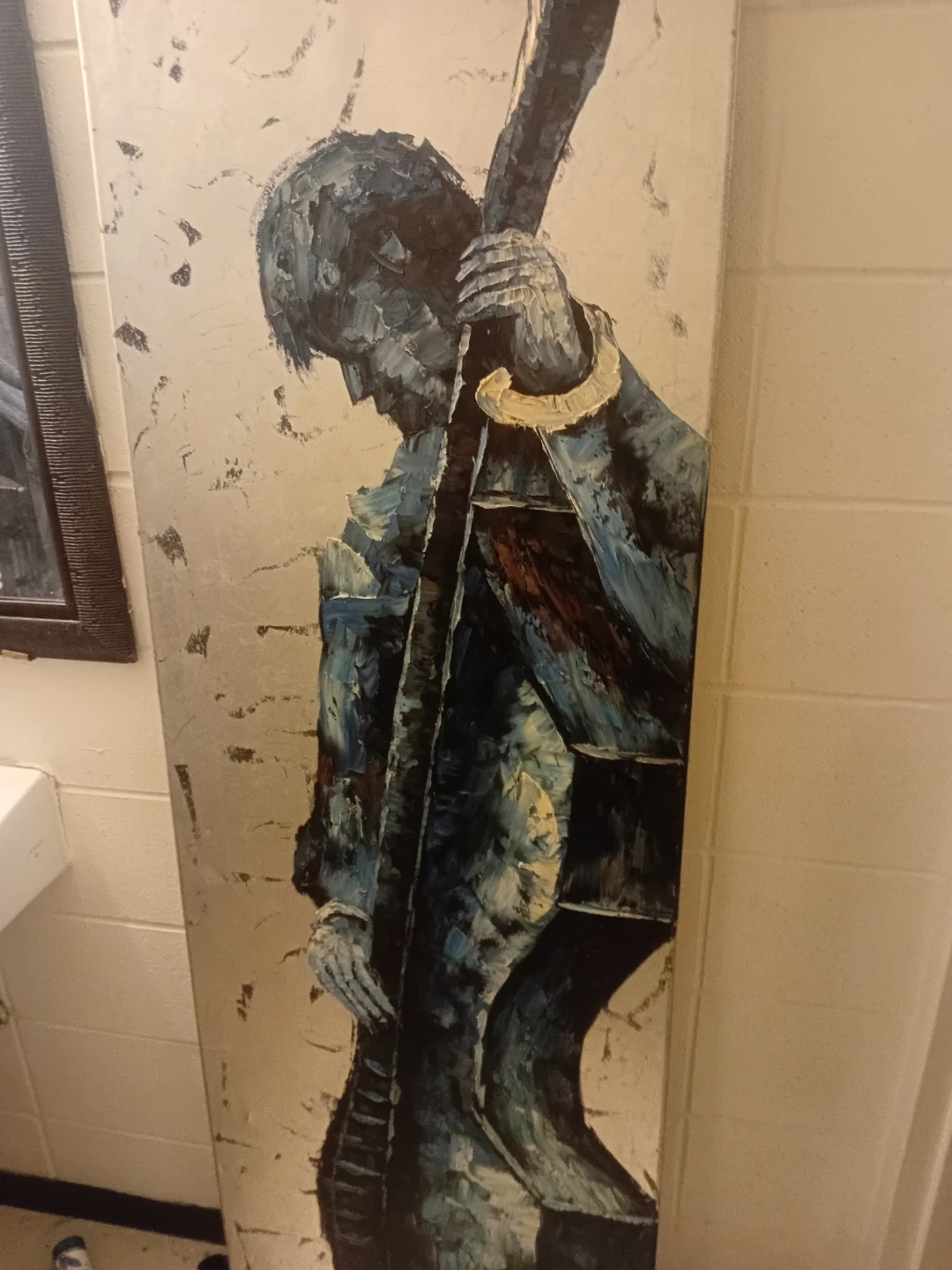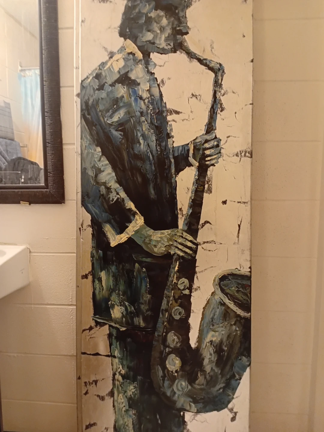 This canvas painting features a jazz musician playing the saxophone. The artwork has a textured, impasto style. It's a vertical piece with blues and grays dominating the palette. This painting would add a unique artistic touch to any music lover's space.
