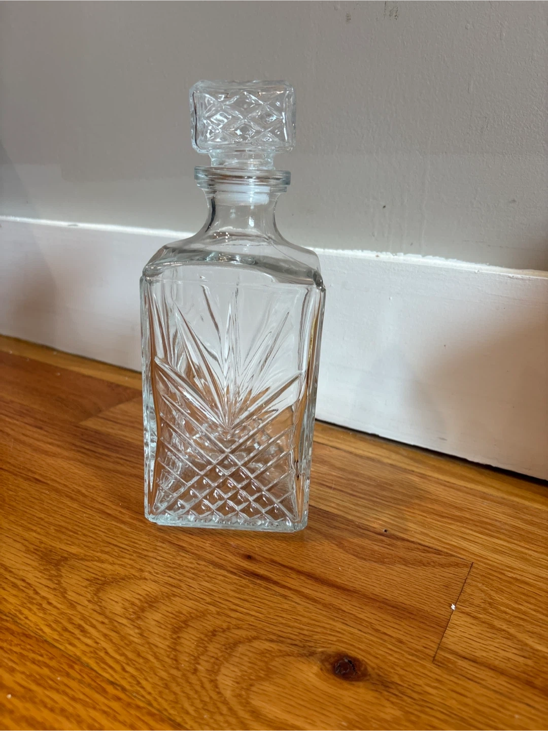 This is a clear glass decanter with a crystal-cut design. It includes a matching stopper. Thick glass material, not real crystal. Perfect for serving spirits or as a decorative piece!