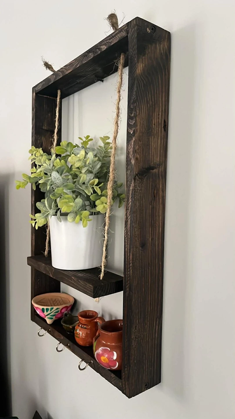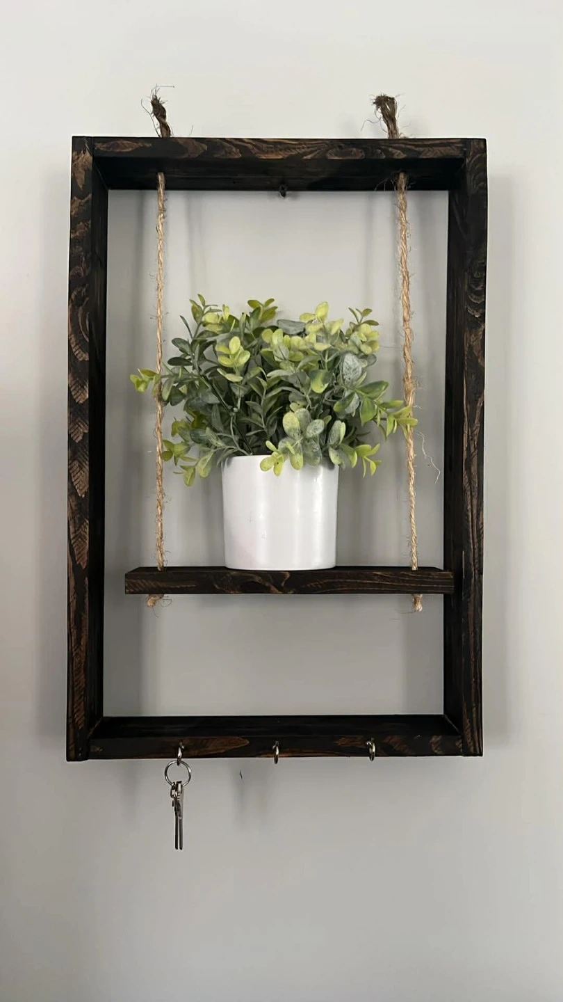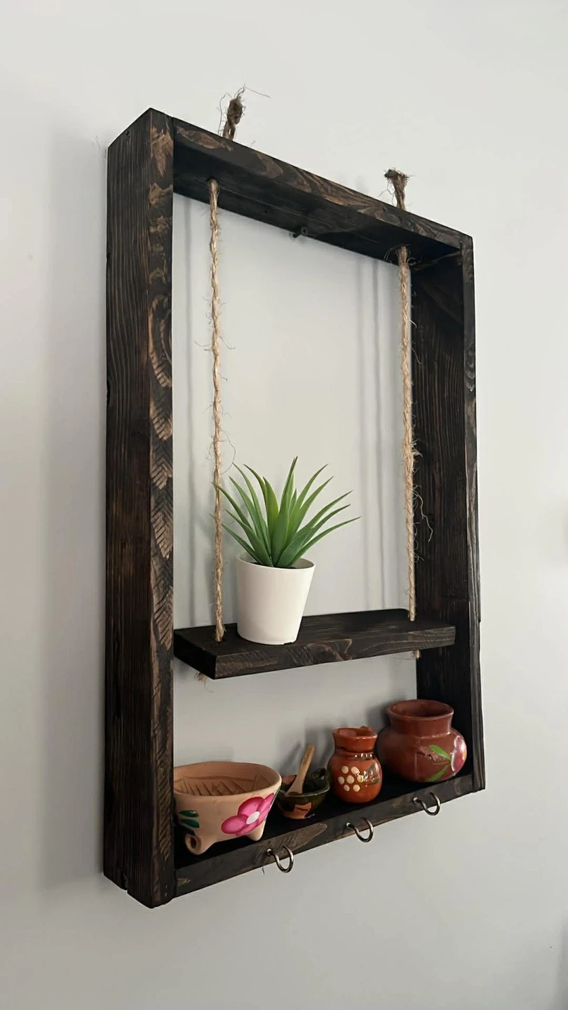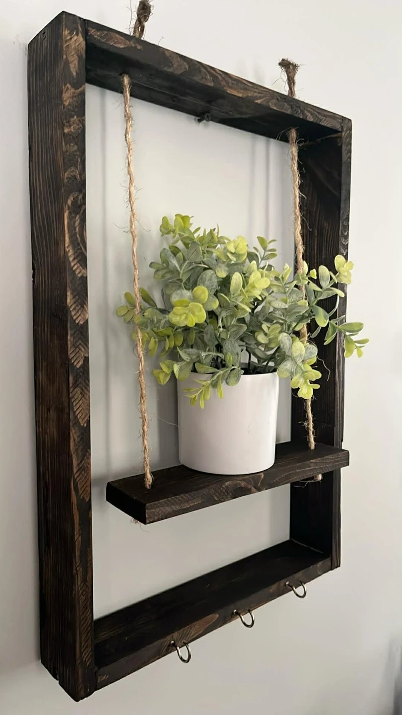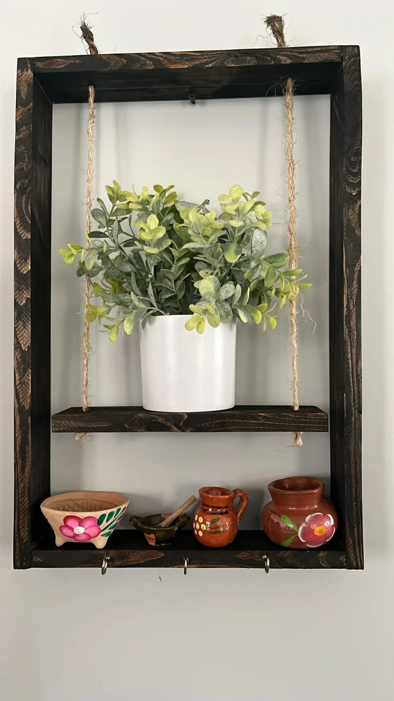This rustic wood shelf is designed for hanging with twine. It features a small lower shelf with three hooks for keys. A faux potted plant is included on the upper shelf for display.(Not included with purchase)