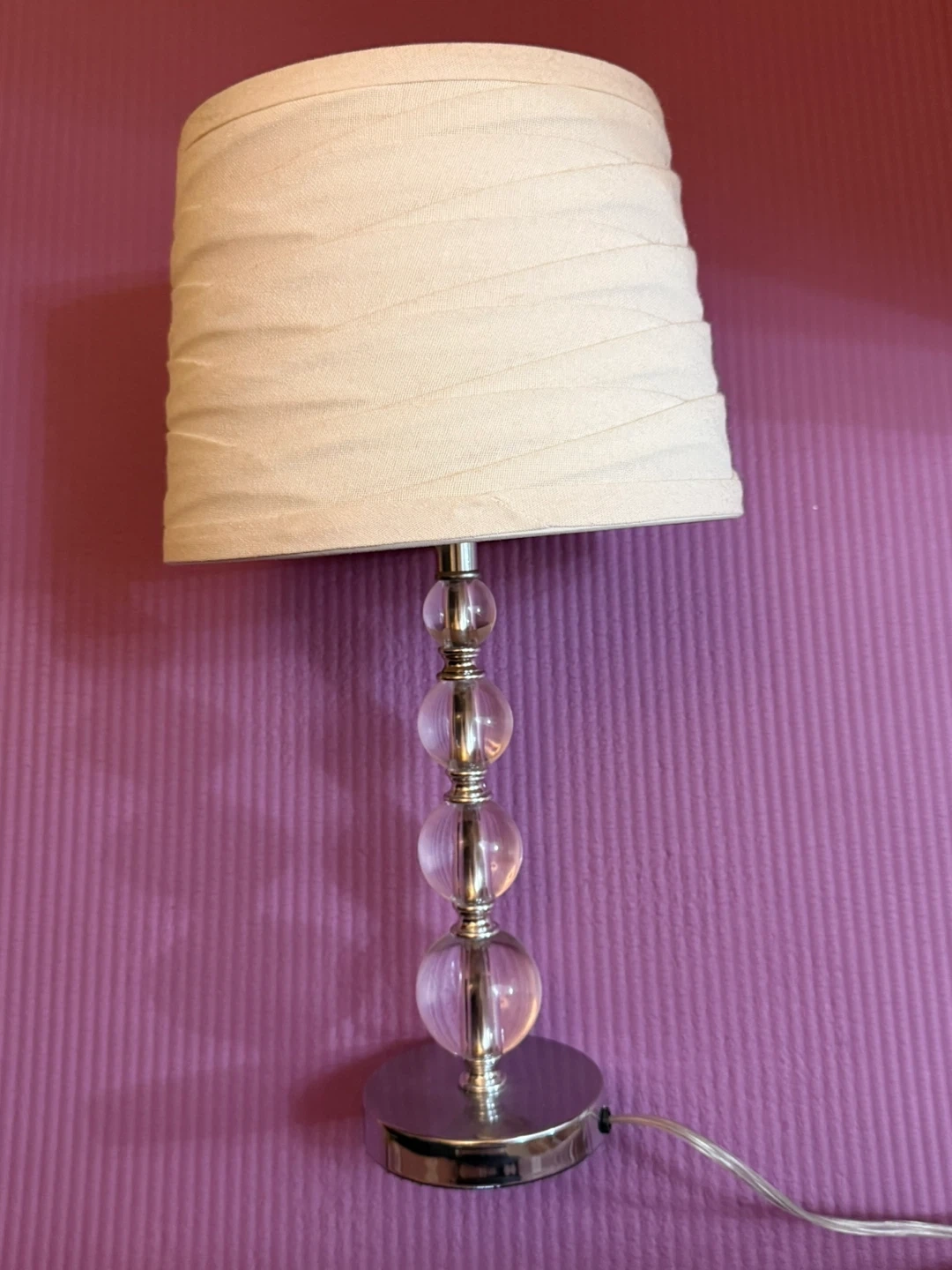 This decorative table lamp features a textured fabric shade. Its base has a polished metal finish with clear glass orb accents. It's a stylish addition to any room's decor. Lamp base is metal and glass.