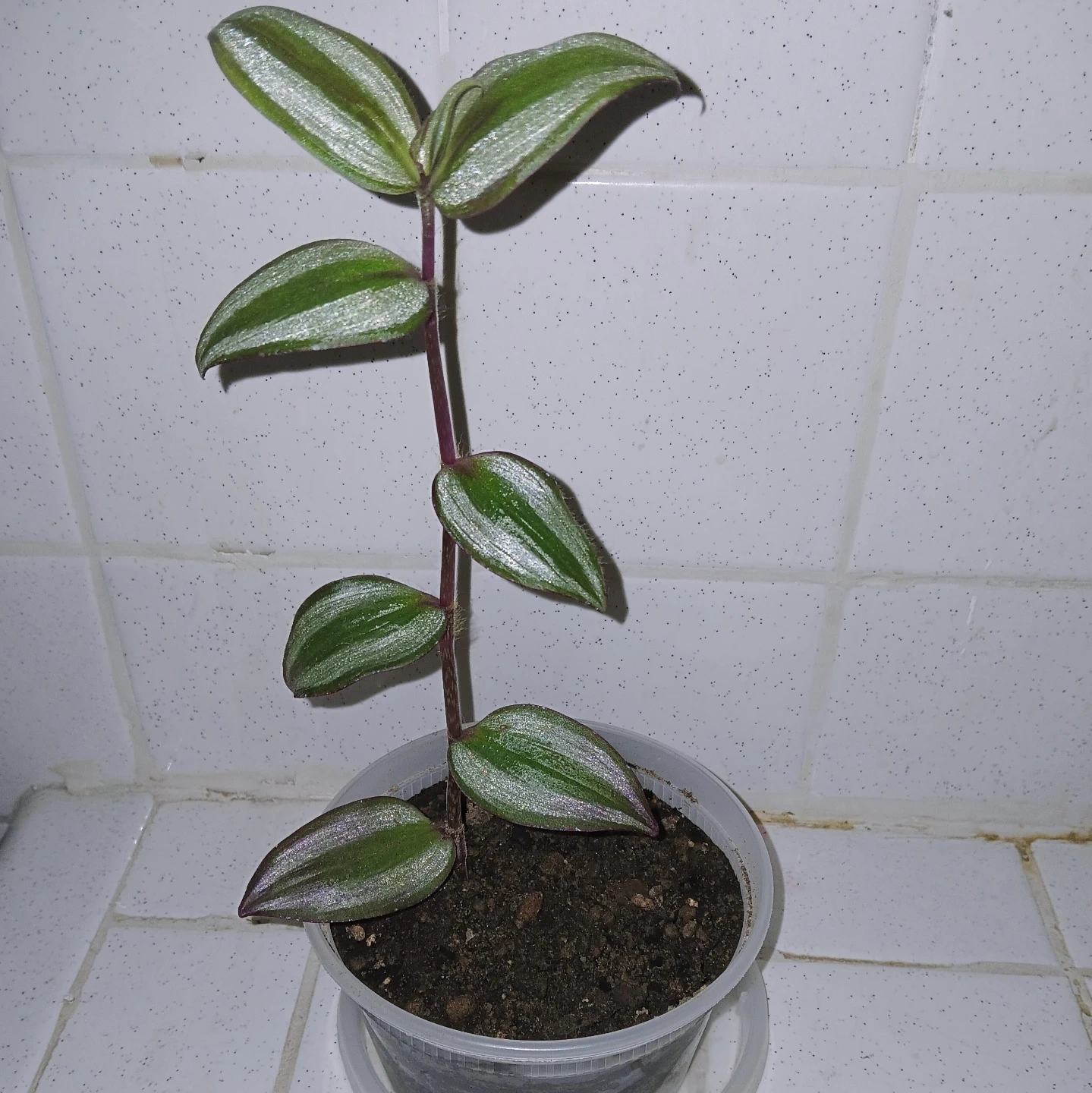 This is a Tradescantia Zebrina plant, also known as a wandering dude. It's in a clear plastic pot with soil. The leaves have a green and silver stripe pattern with purple undersides. It's a great houseplant for easy care!