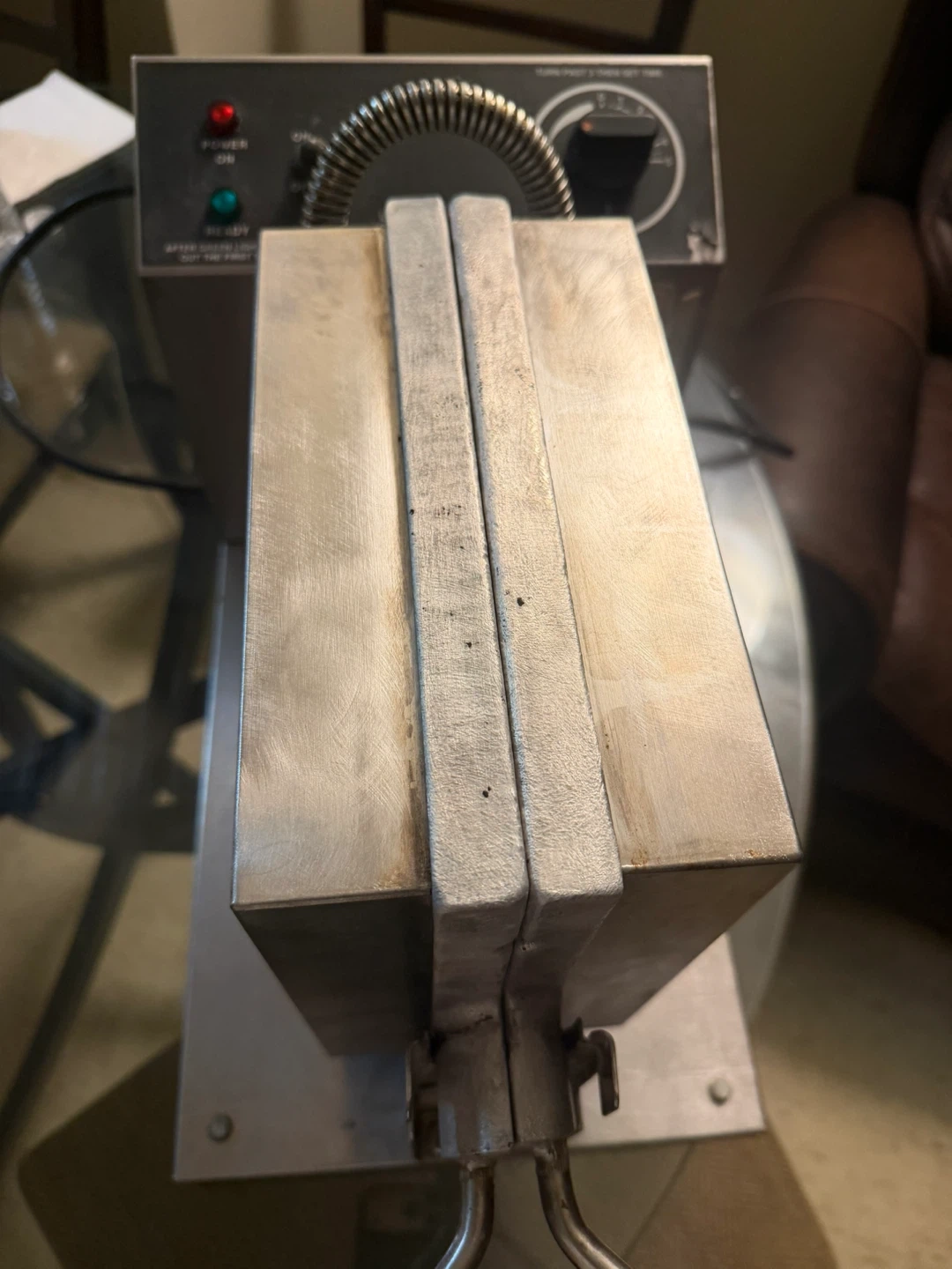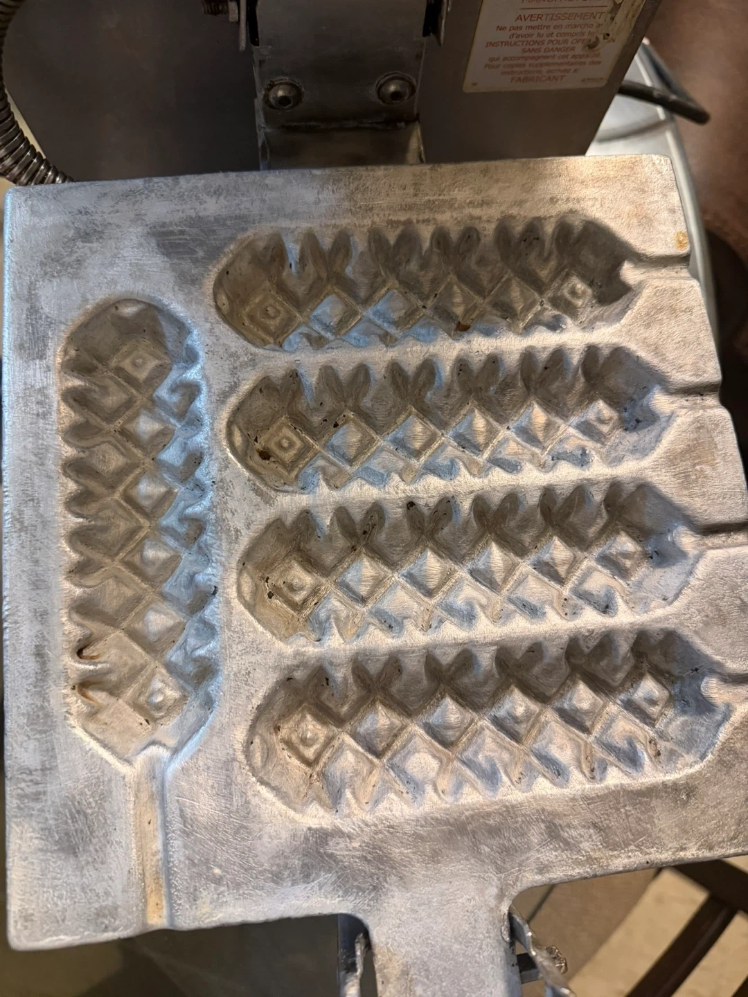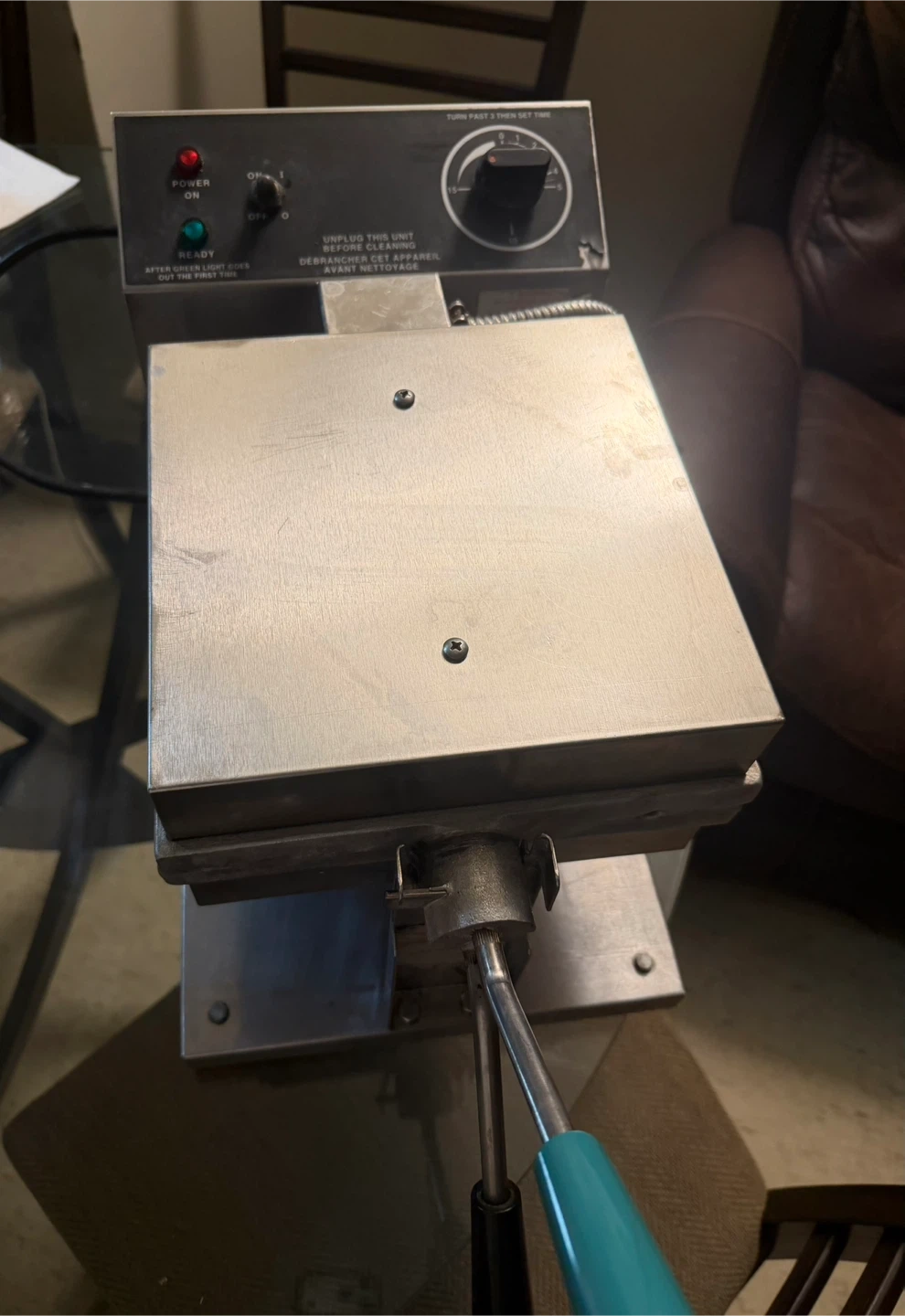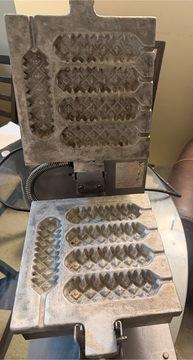 This commercial waffle maker is designed for making waffle sticks. It features a stainless steel construction and a timer. The unit includes non-stick grids for easy cleanup. It's suitable for high-volume operations.