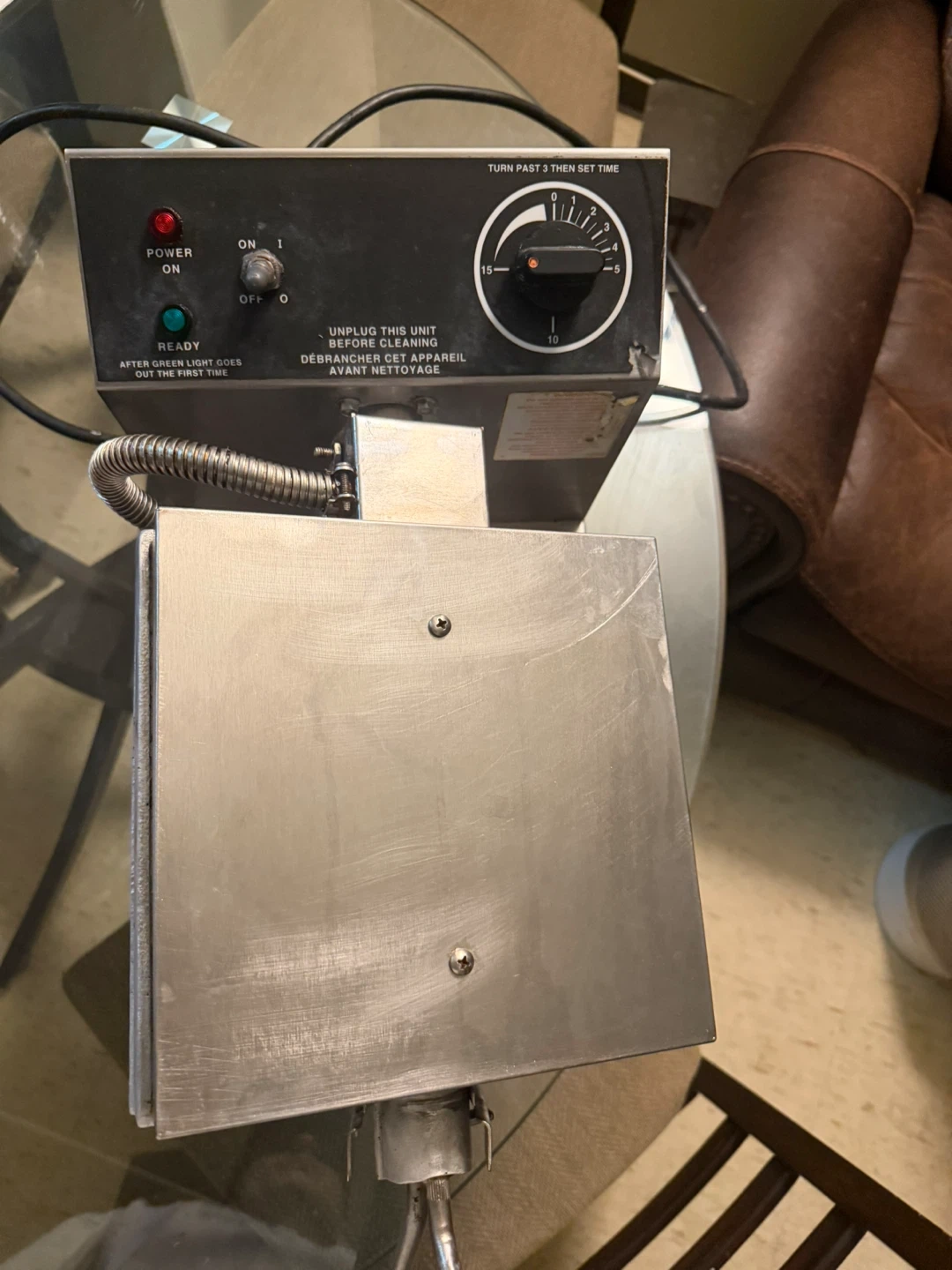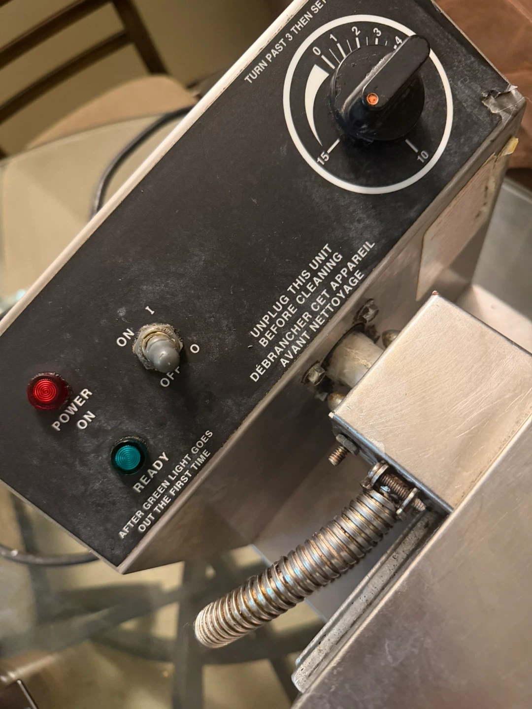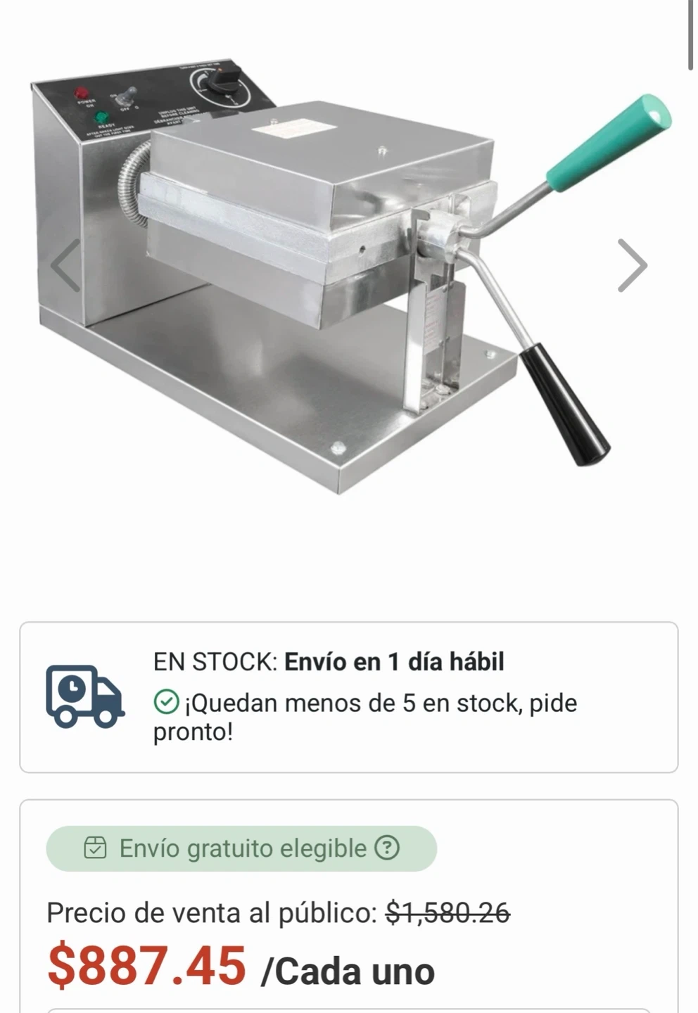 This commercial waffle maker is designed for making waffle sticks. It features a stainless steel construction and a timer. The unit includes non-stick grids for easy cleanup. It's suitable for high-volume operations.