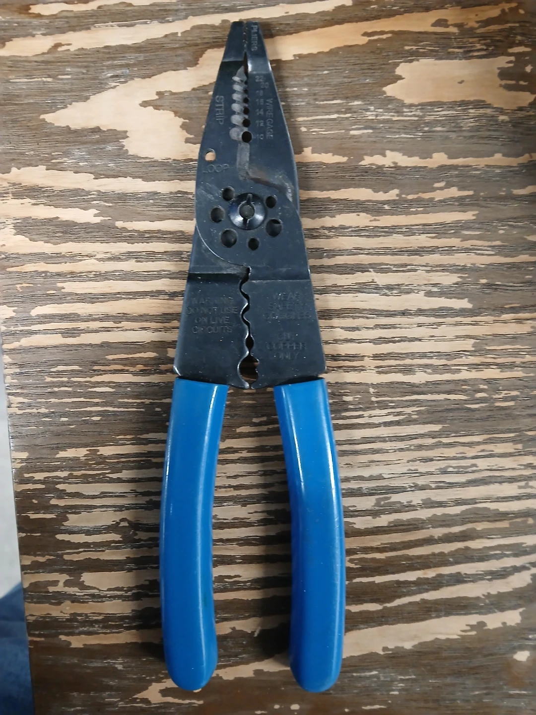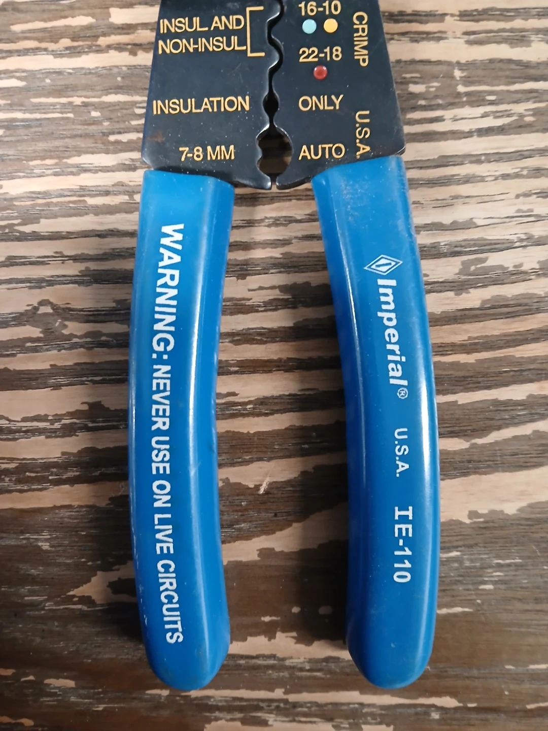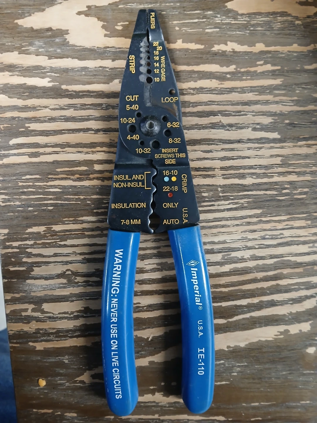 This is an Imperial TE-110 wire stripper and crimper tool. It's made in the U.S.A. and features wire stripping for gauges 10-22, cutting, looping, and crimping functions. It also includes a screw insert feature.