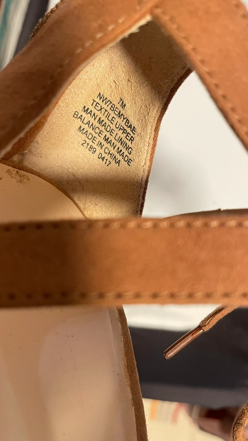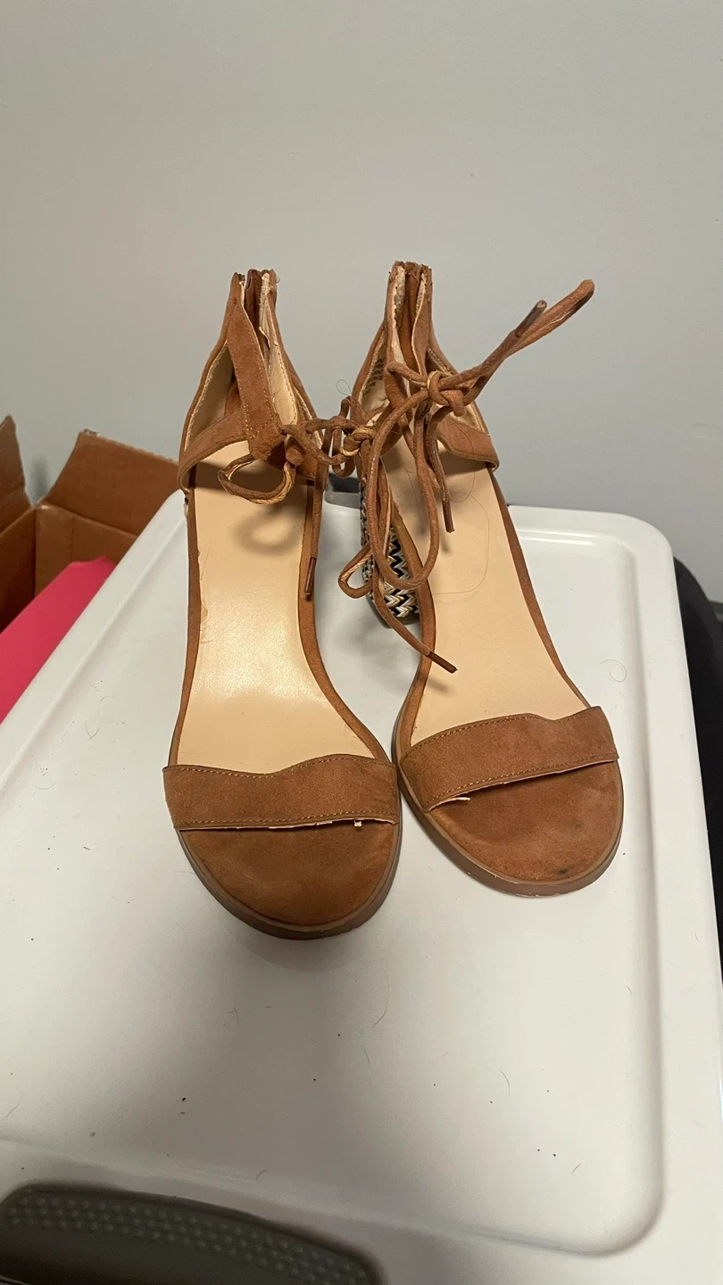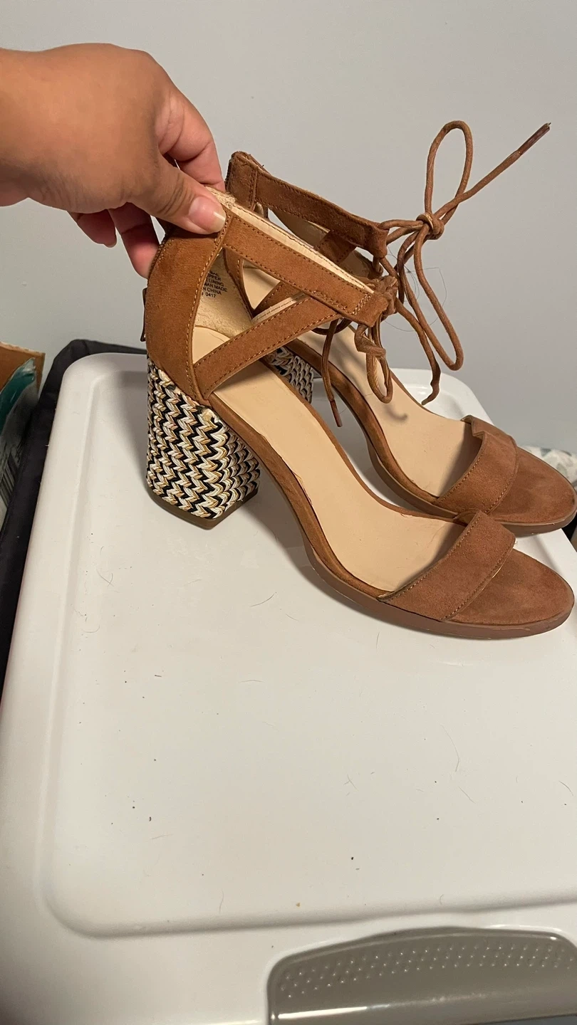 Stylish brown suede sandals with a unique woven block heel. Features tie-up ankle straps for a secure fit. Man-made lining and sole. Imported.