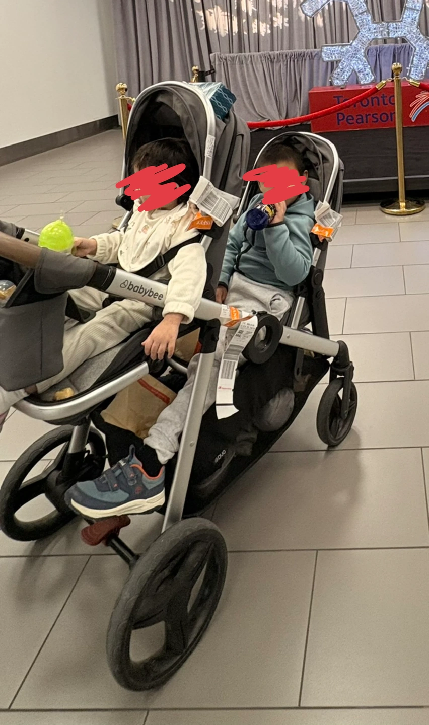 This is a Babybee Duo double stroller. It's grey and features a versatile design for two children. It offers a smooth ride for little ones on the go!