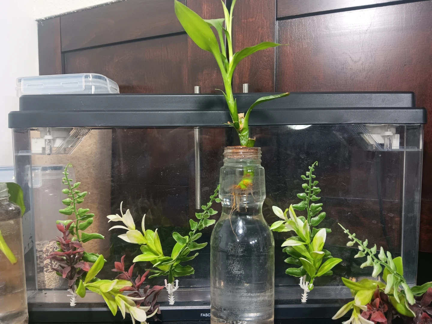A lucky bamboo plant is growing in a clear glass bottle. The bottle is placed in front of a small aquarium tank that has some artificial plants. It's a unique decorative piece for any home or office!