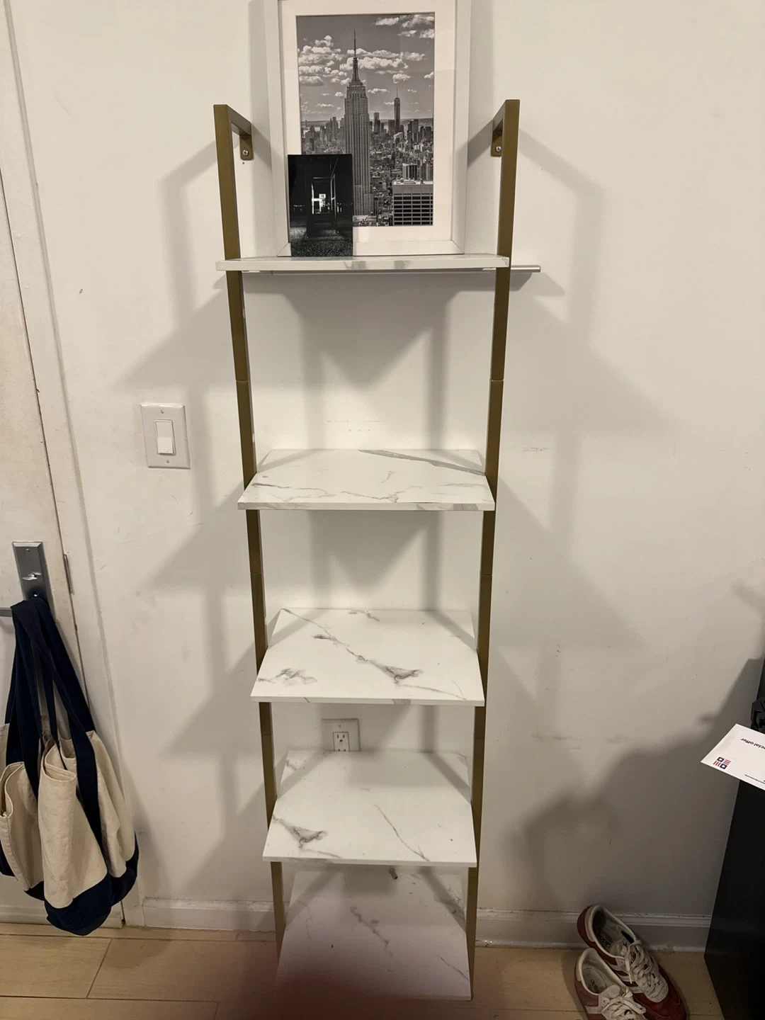 This stylish ladder bookshelf features white marble-look shelves and a gold metal frame. It's perfect for displaying books, decor, or plants. The open design provides easy access and a modern look to any room!