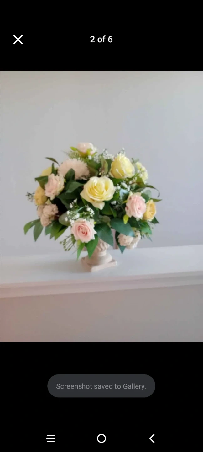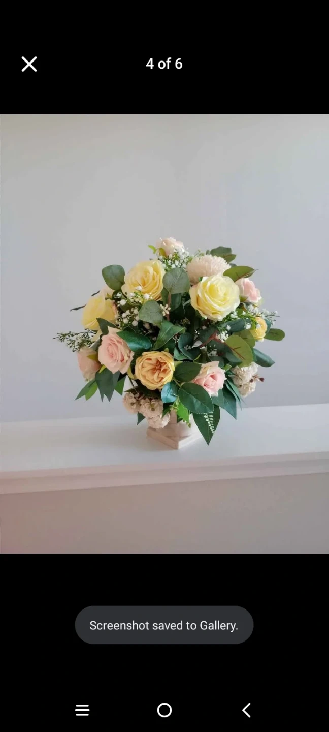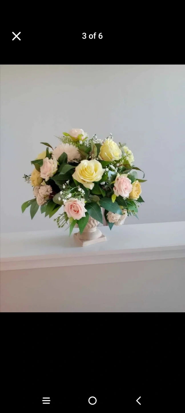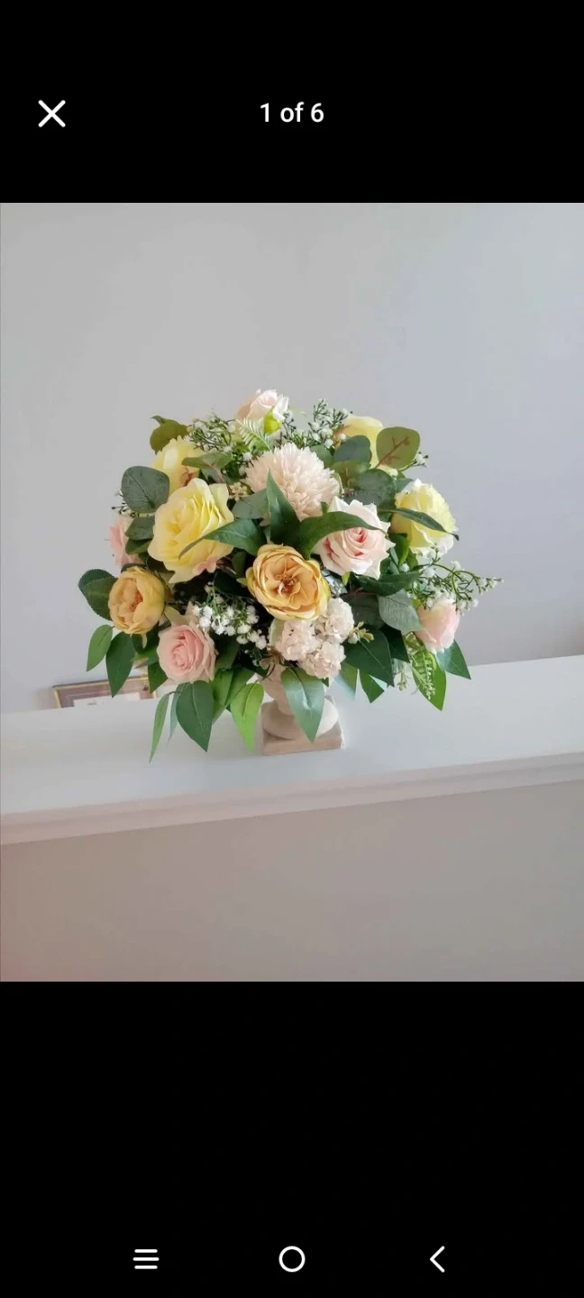 This beautiful artificial floral arrangement features beautiful flowers decorative urn. It's perfect for adding a touch of elegance to any room. The arrangement includes various shades of pink, yellow, and white flowers with lush green foliage.