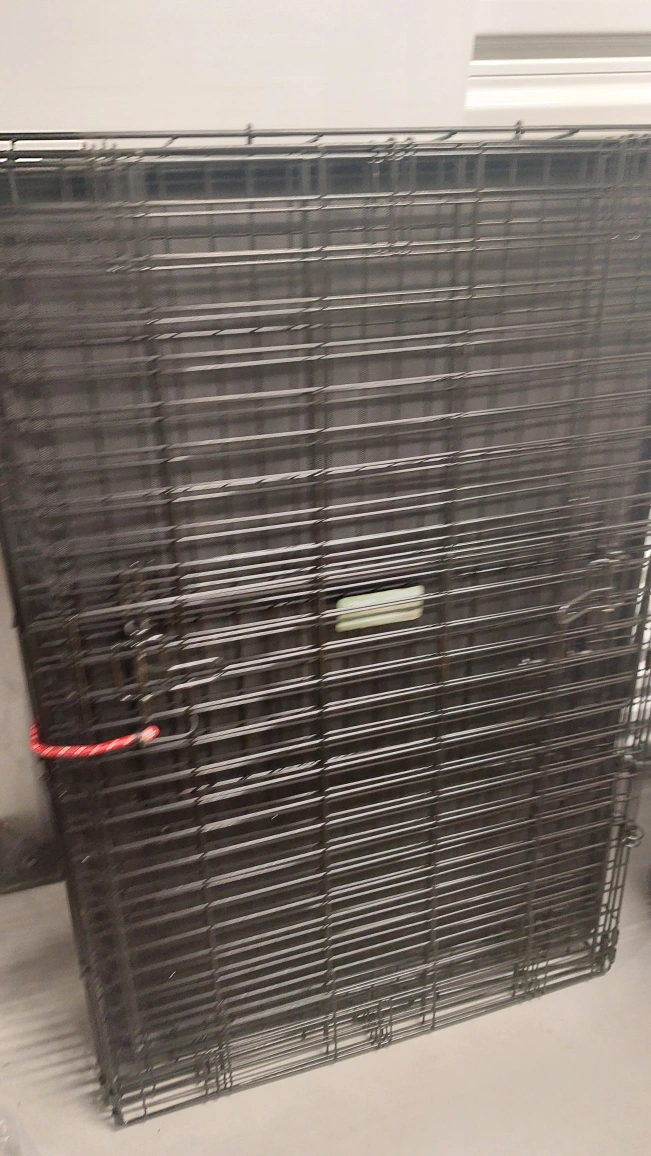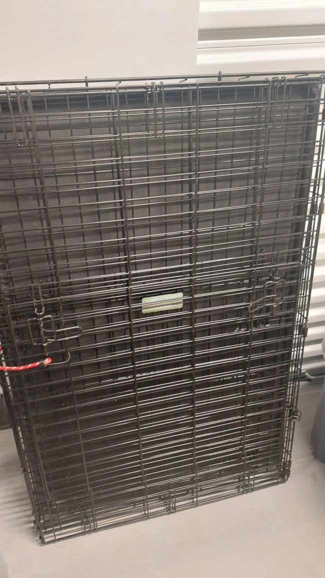 Dog crate for large dogs. Dimensions: 42 (Length) × 28 (Width) × 30 (Height) black wire dog crate. Made from metal wire with a dark interior. Great for crate training your pet, creating a safe space for them