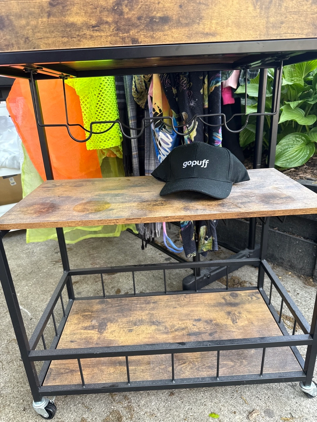 Beautiful barely used black iron and wood bar cart with wine and glass storage. Removable serving top! Four silver caster wheels for easy use!