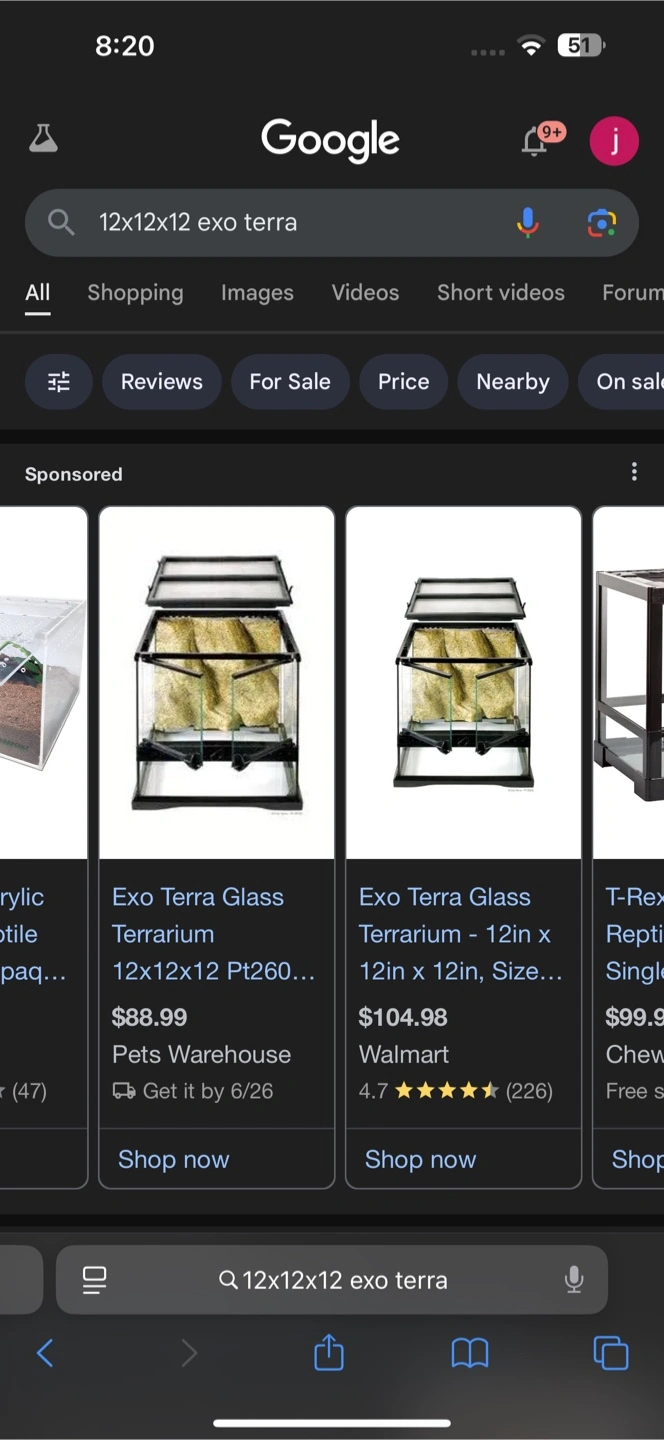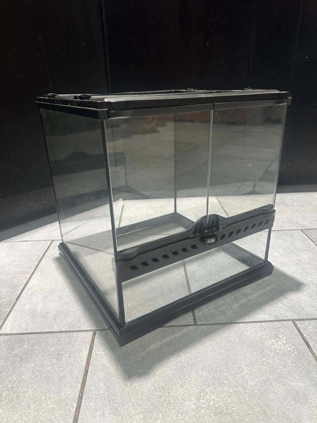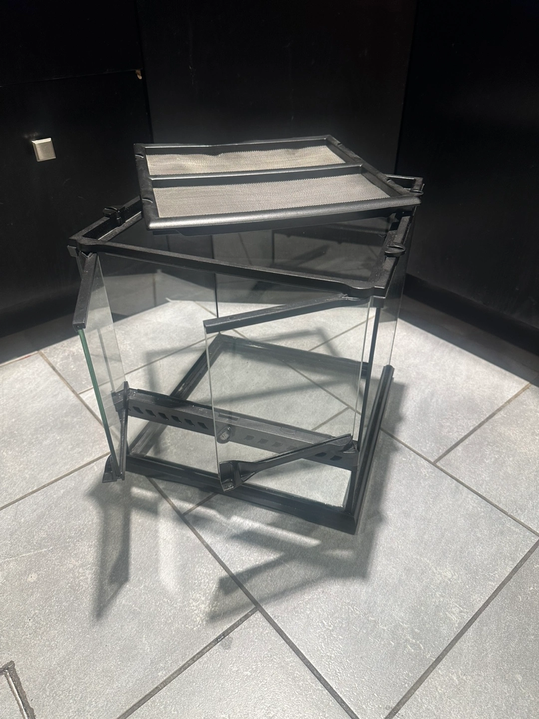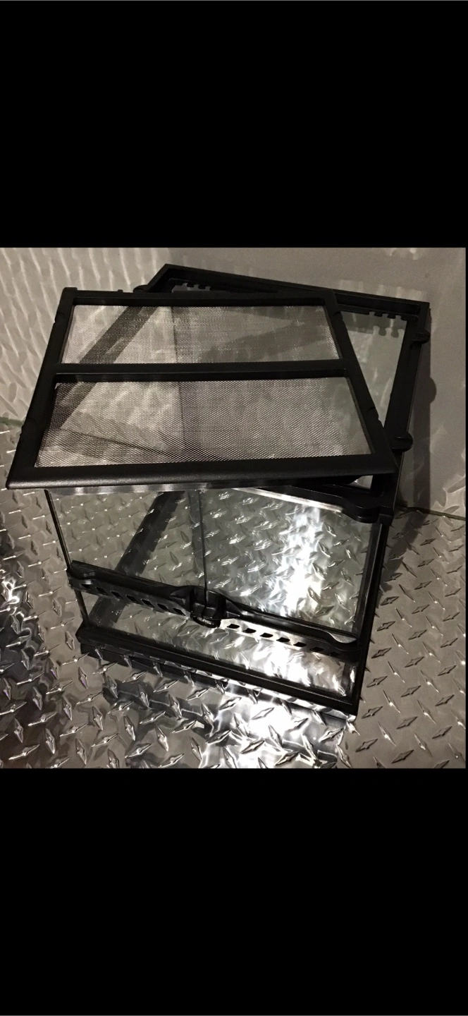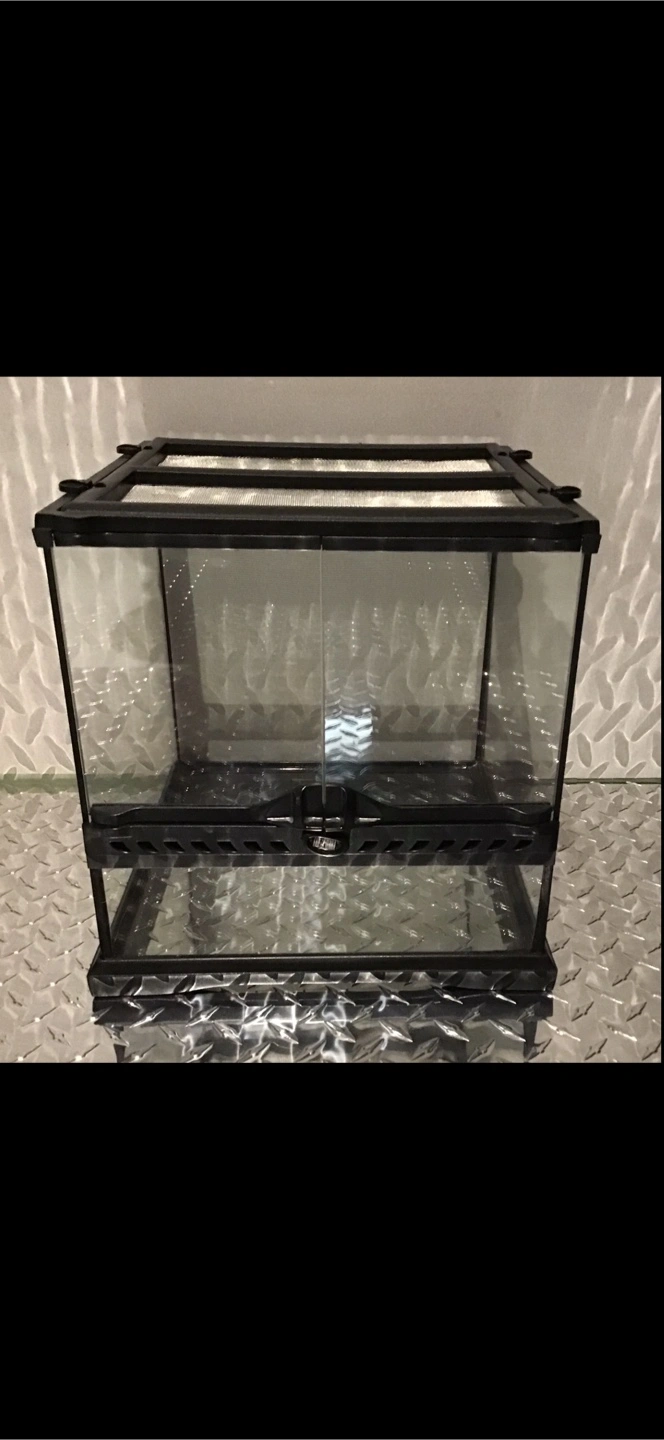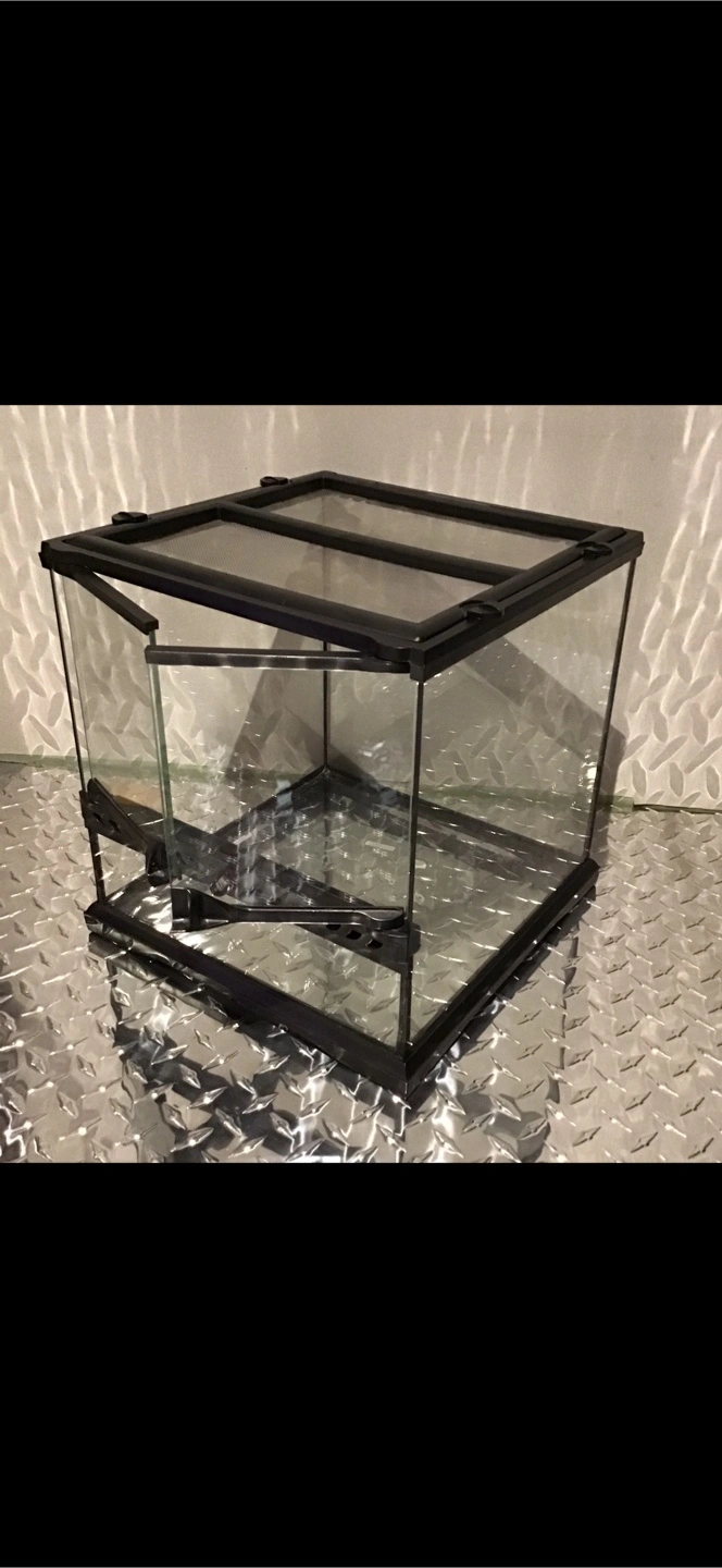 12 x 12 x 12 glass terrarium for reptiles. My lizard outgrew his tank. Doors and top screen are operational. The original price of this item can be up to $100. There was a light that burnt the plastic but the screen is still operational as you see in the photo. Pick up only.