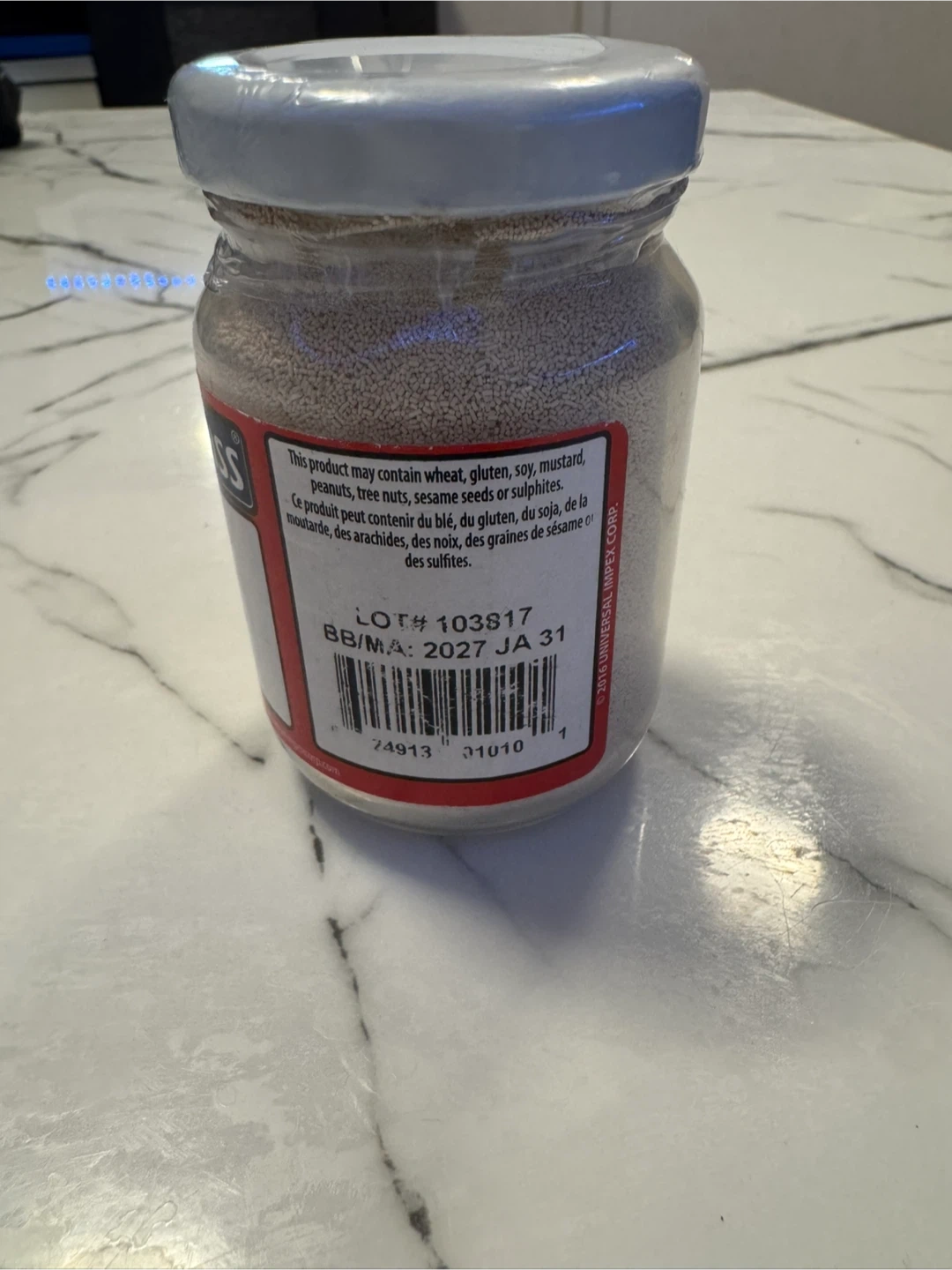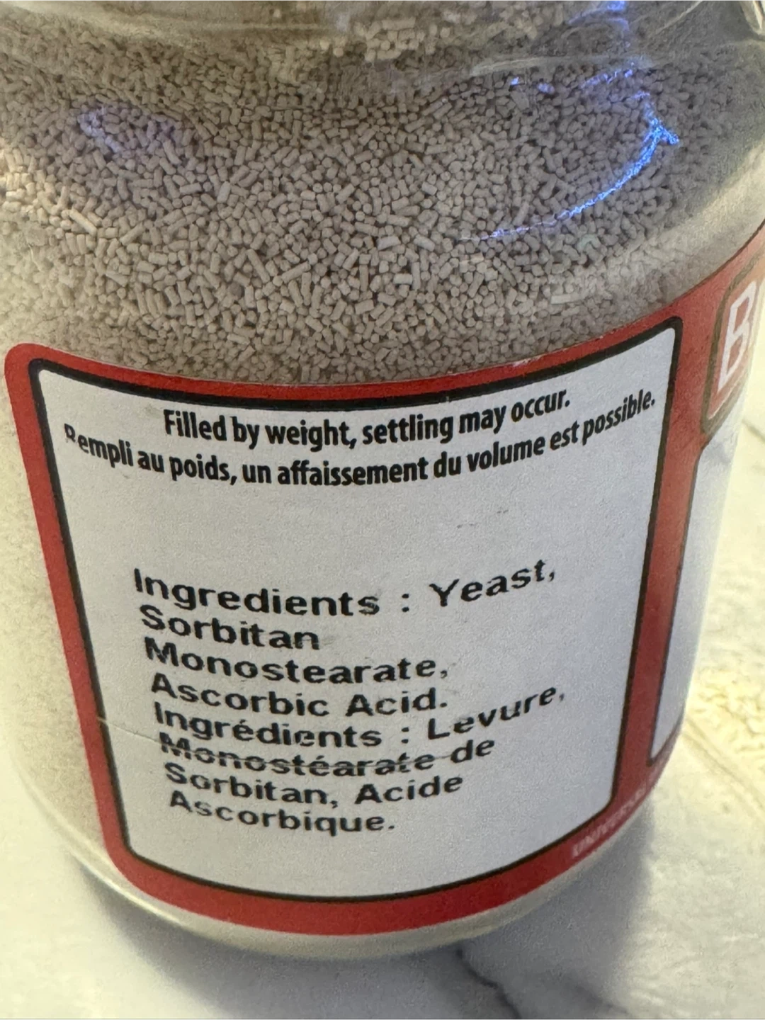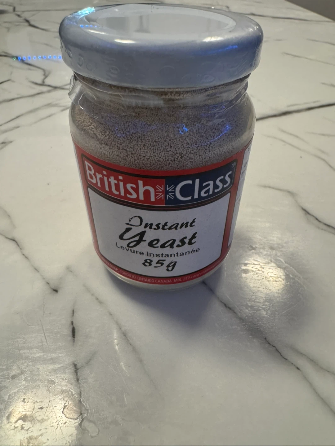 This jar contains 85g of British Class Instant Yeast. It's made with yeast, sorbitan monostearate, and ascorbic acid. This yeast is useful for baking bread and other yeasted doughs. Best before Jan 31, 2027