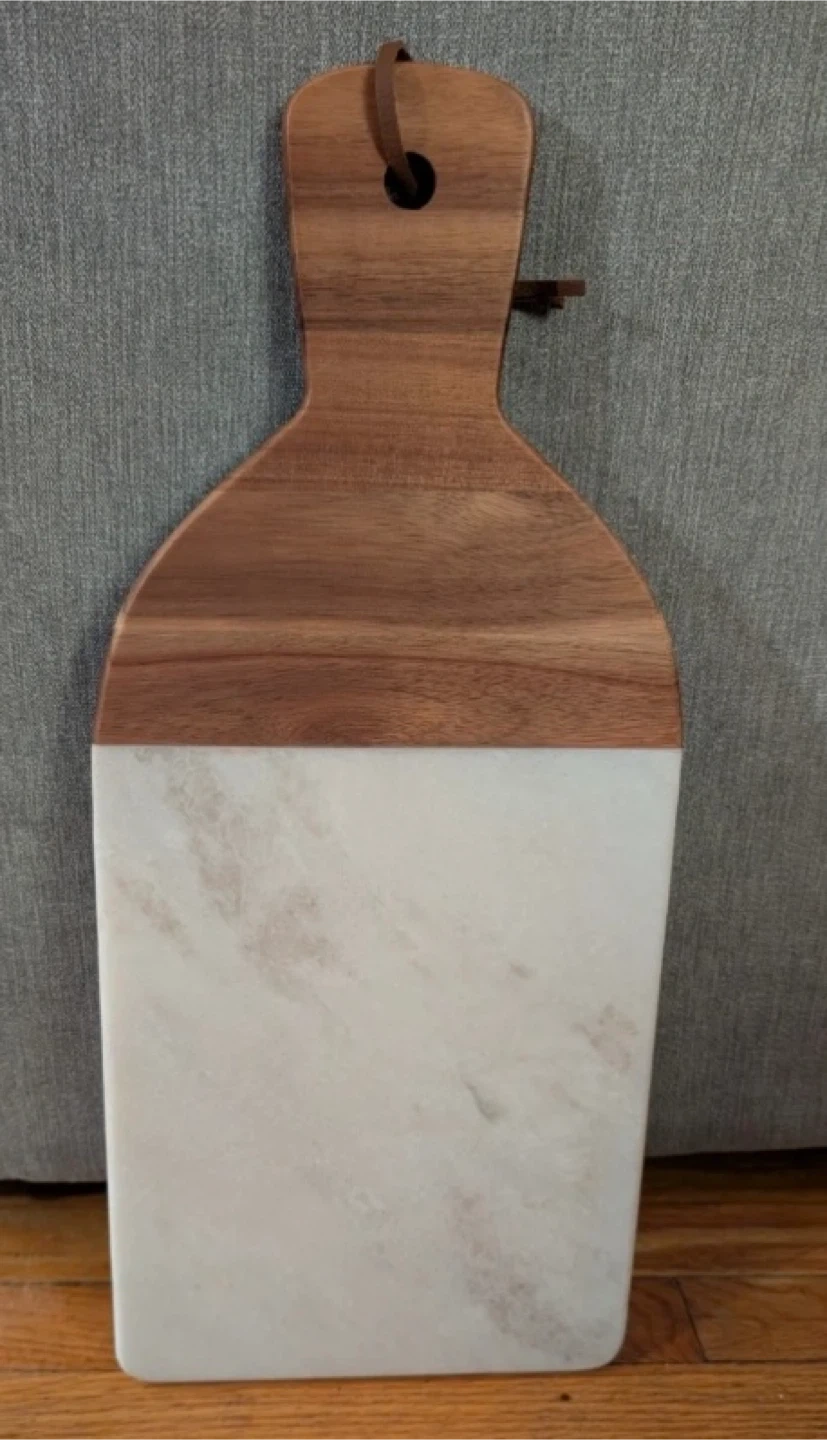 This cutting board is made of a combination of wood and marble. It features a convenient handle for easy carrying. It's perfect for chopping vegetables or serving appetizers.