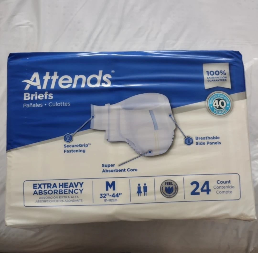 Attends Briefs adult diapers feature extra heavy absorbency and a super absorbent core. They have a SecureGrip fastening and breathable side panels. This package contains 24 briefs in size Medium, fitting waists 32" to 44".
