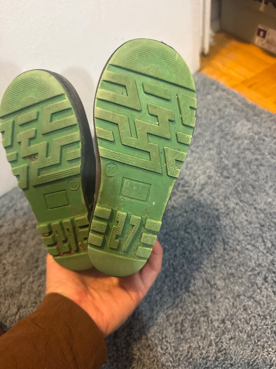 These kids' Joe Fresh rubber rain boots feature a fun dragon and umbrella print. They're black with green soles and pull-on handles. Size is 10.