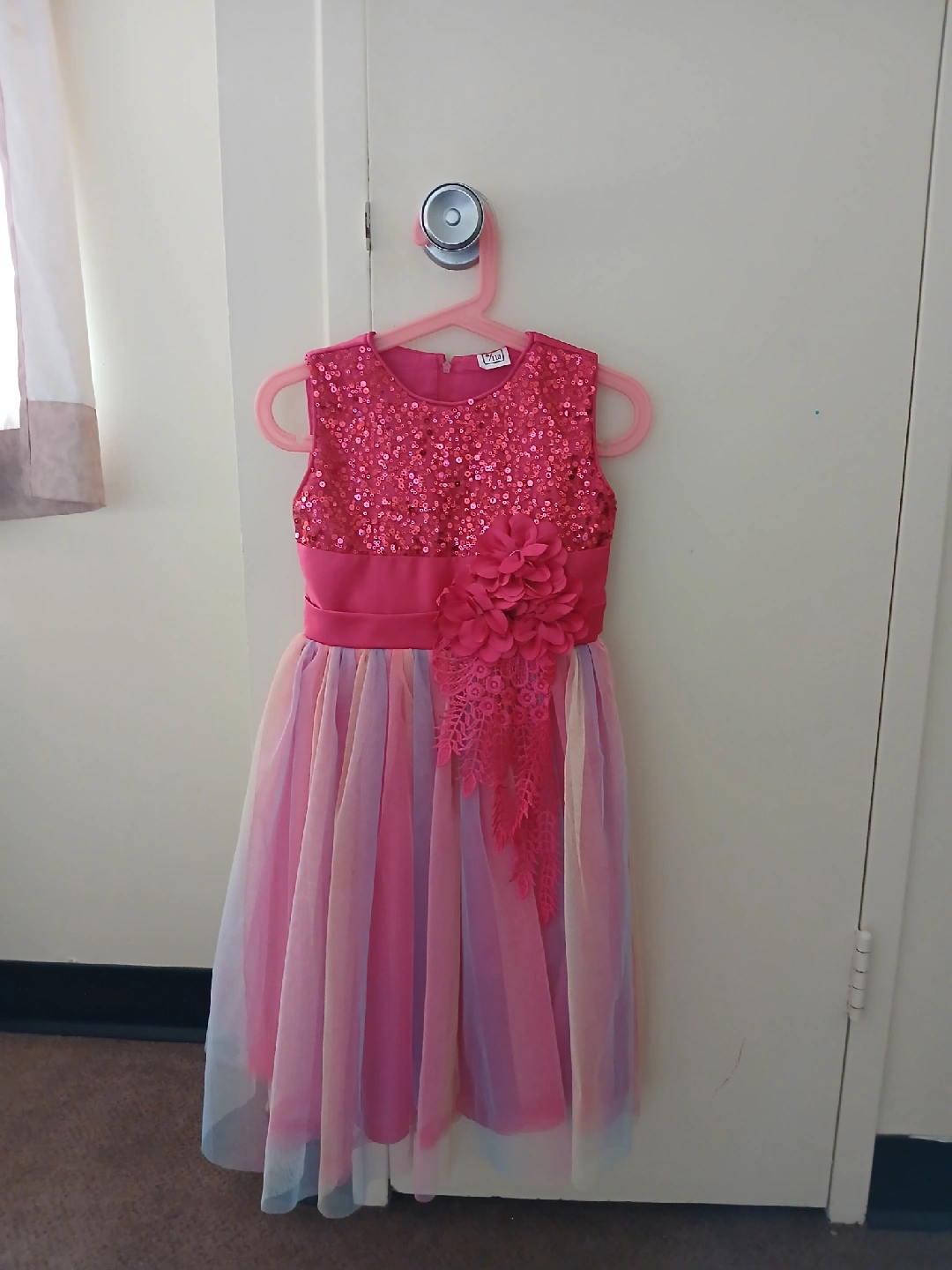 A beautiful pink dress for girls 4 or 5 years old! The top is covered in sequins, and it has a pretty flower detail on the waist.