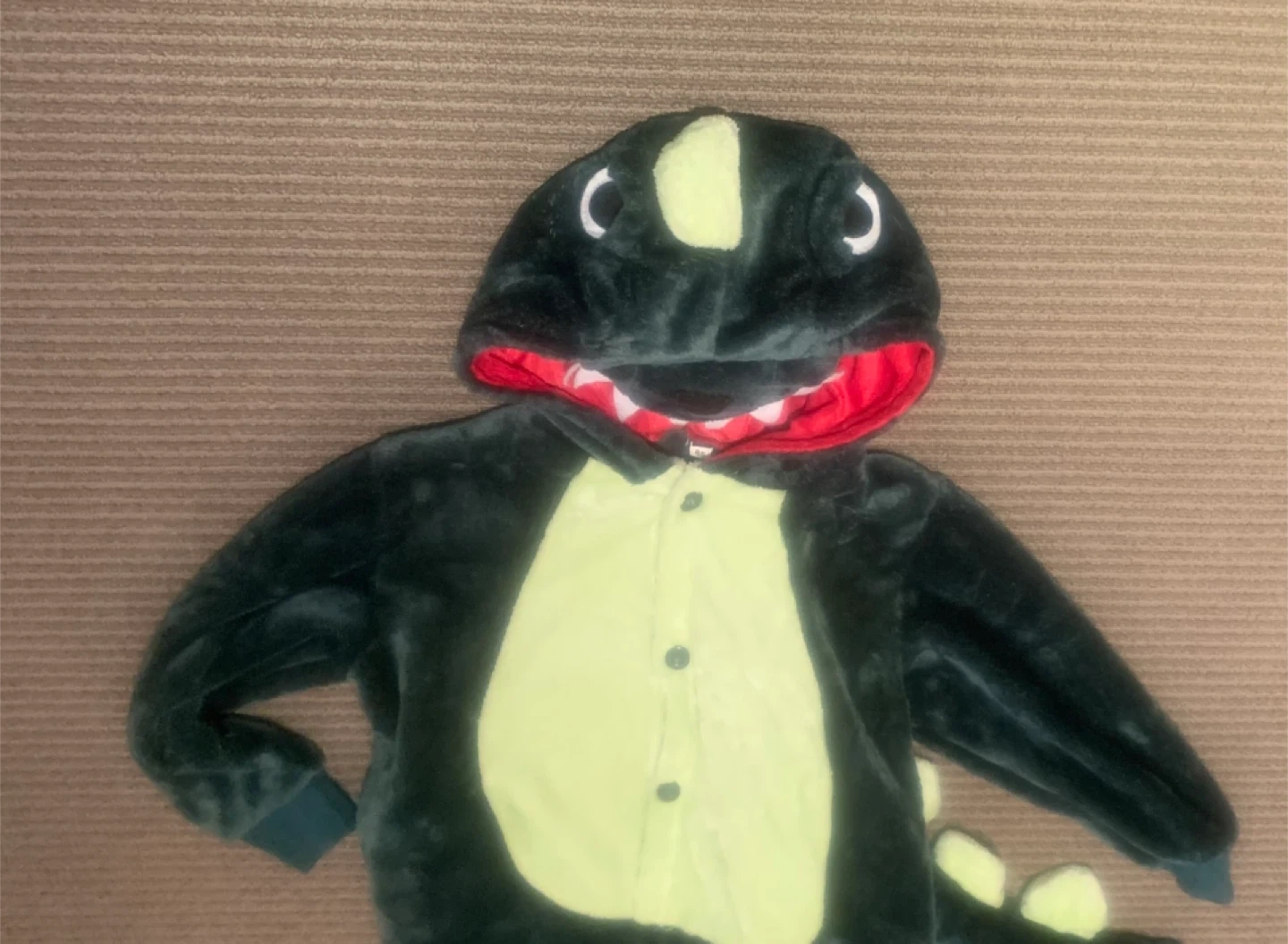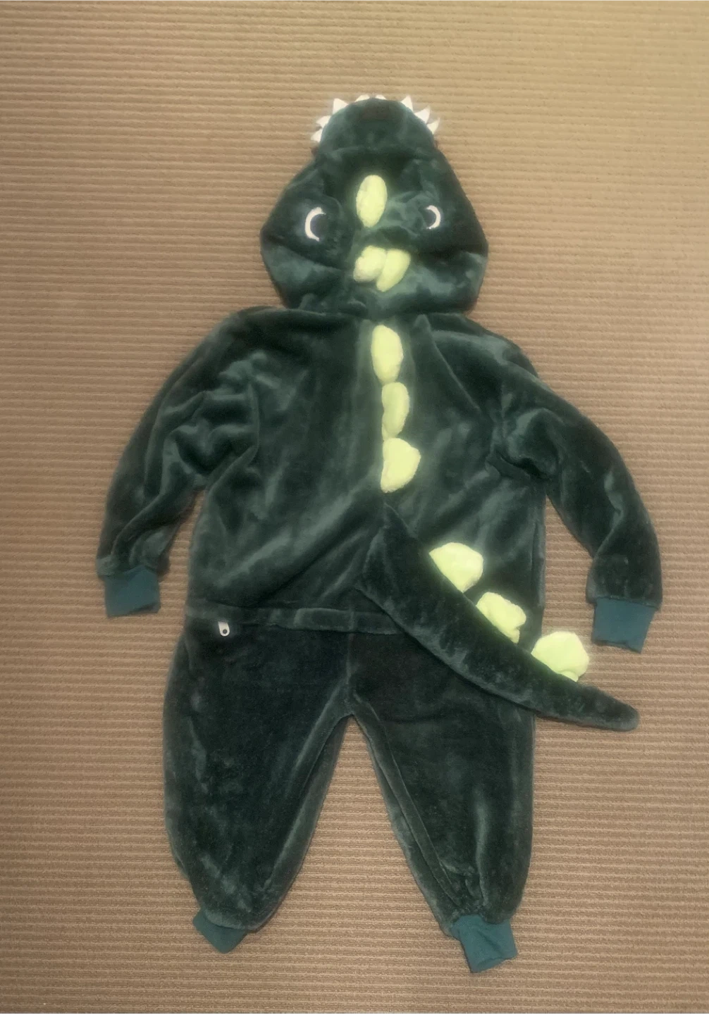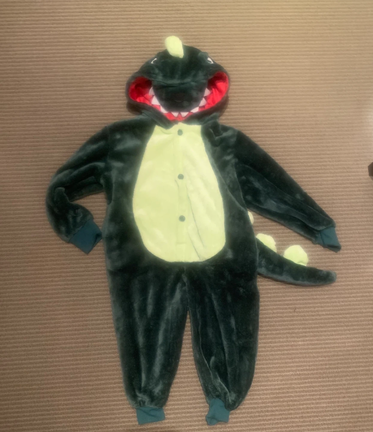 Selling a cute dinosaur onesie for kids! It's in great condition and perfect for dress-up or cozy days at home. The onesie features a hood with dinosaur details and a tail.