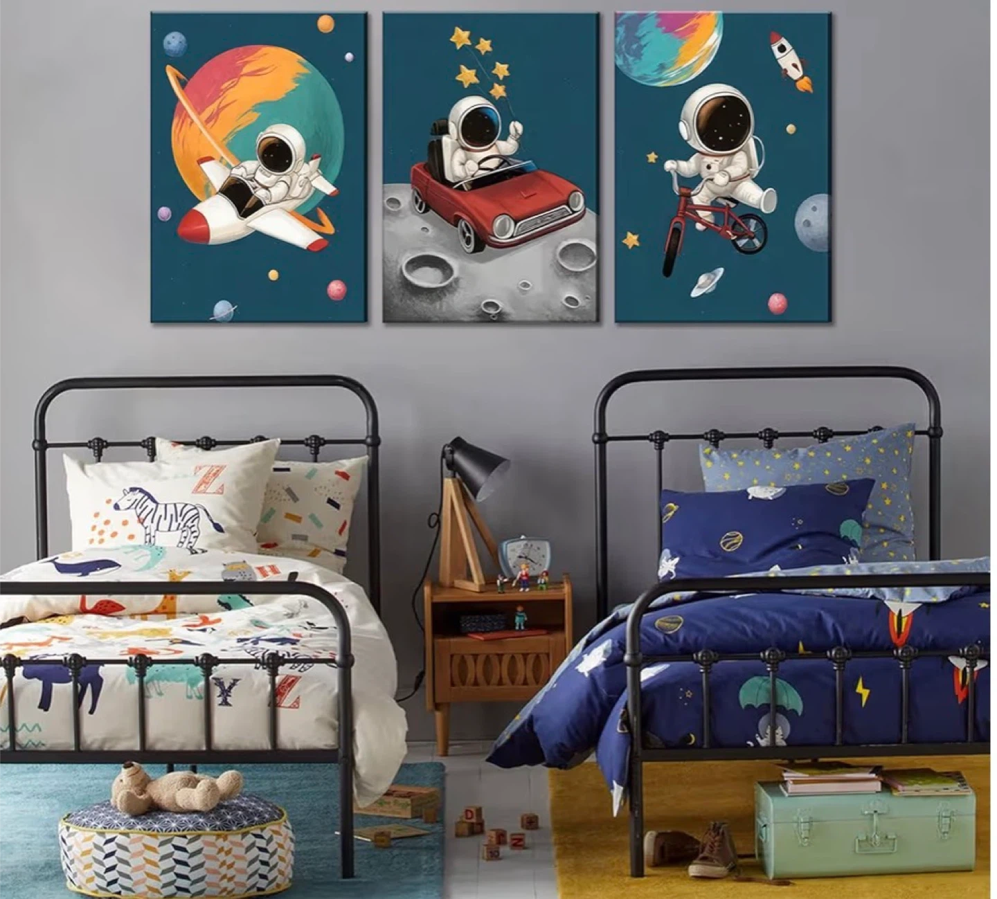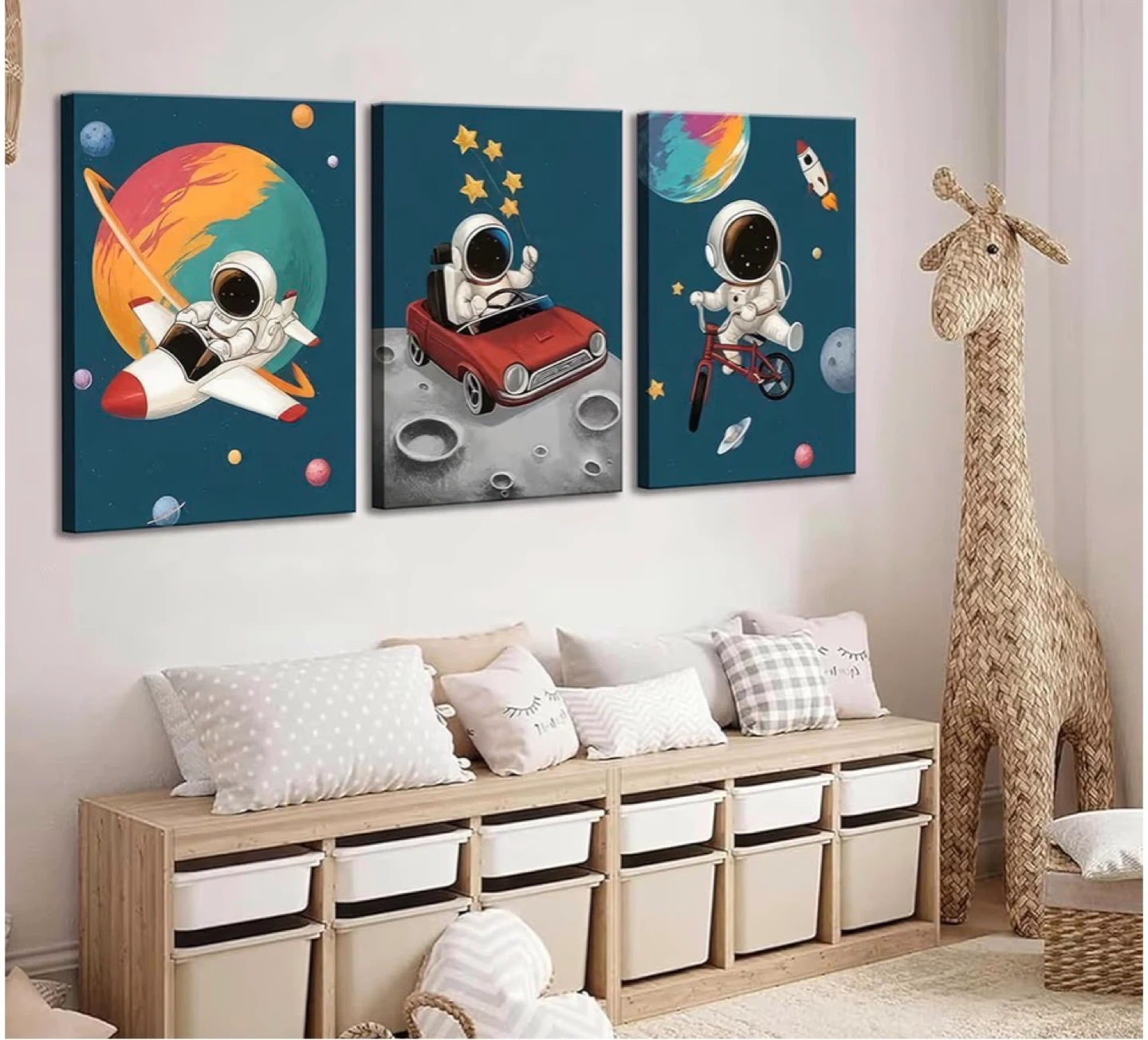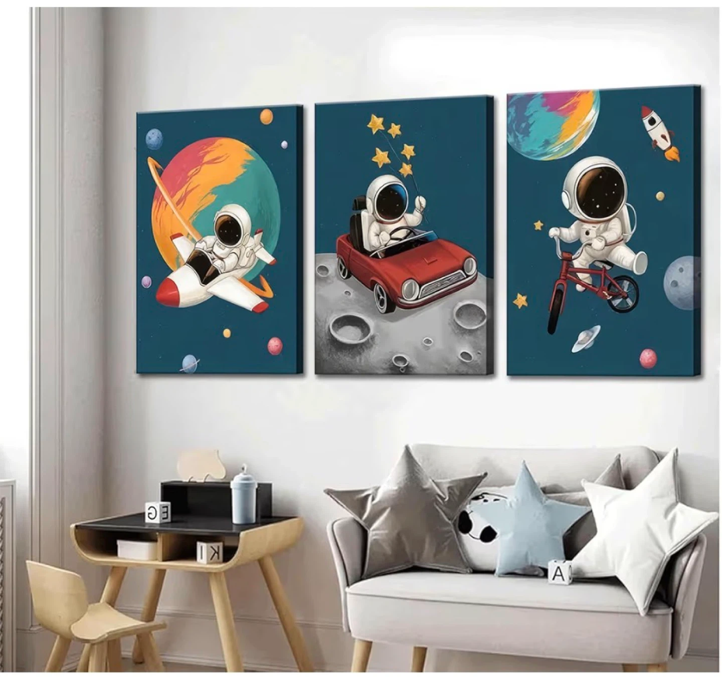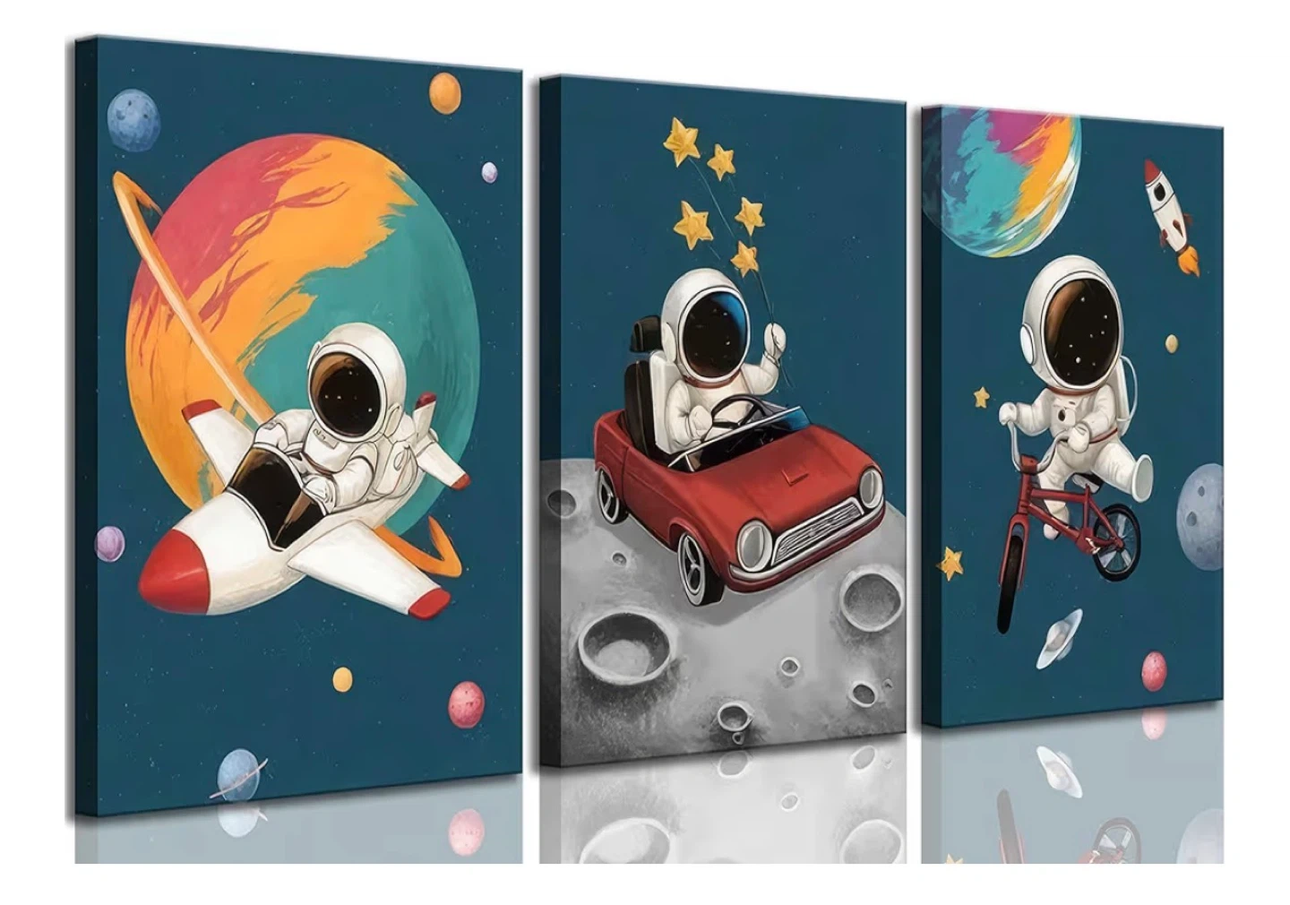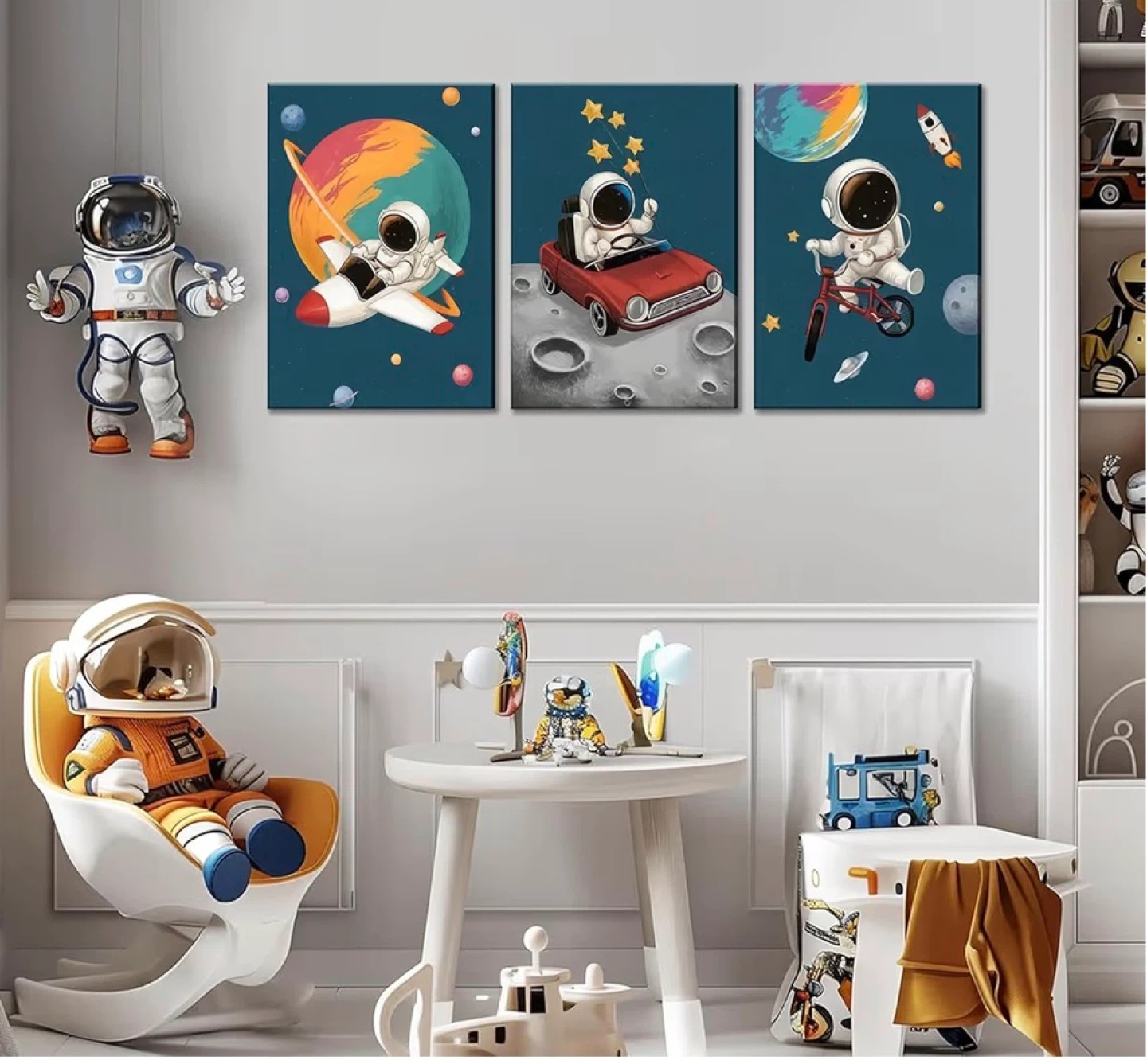 This is a set of three canvas wall art prints featuring astronauts in space. Each panel has a unique design with vibrant colors and playful imagery. It's a fun addition to a child's room or any space-themed decor!