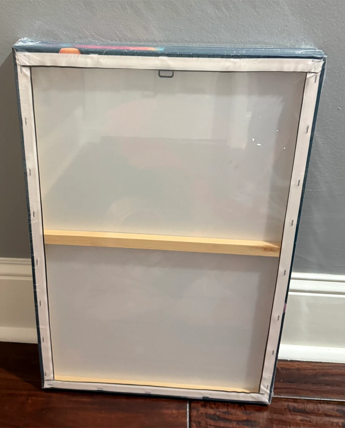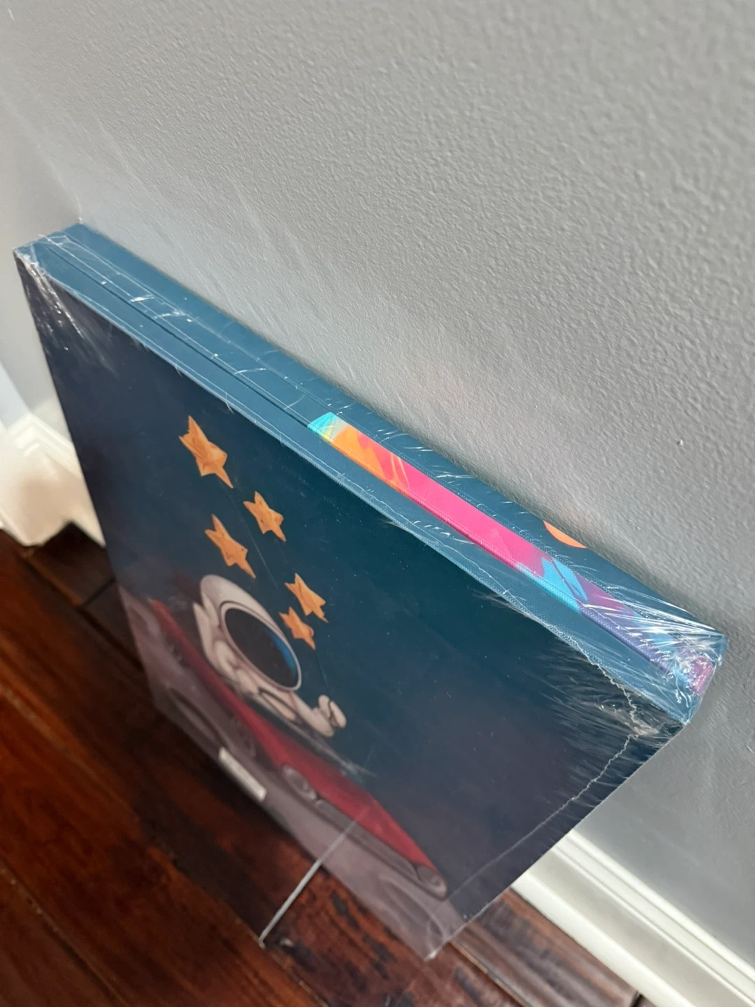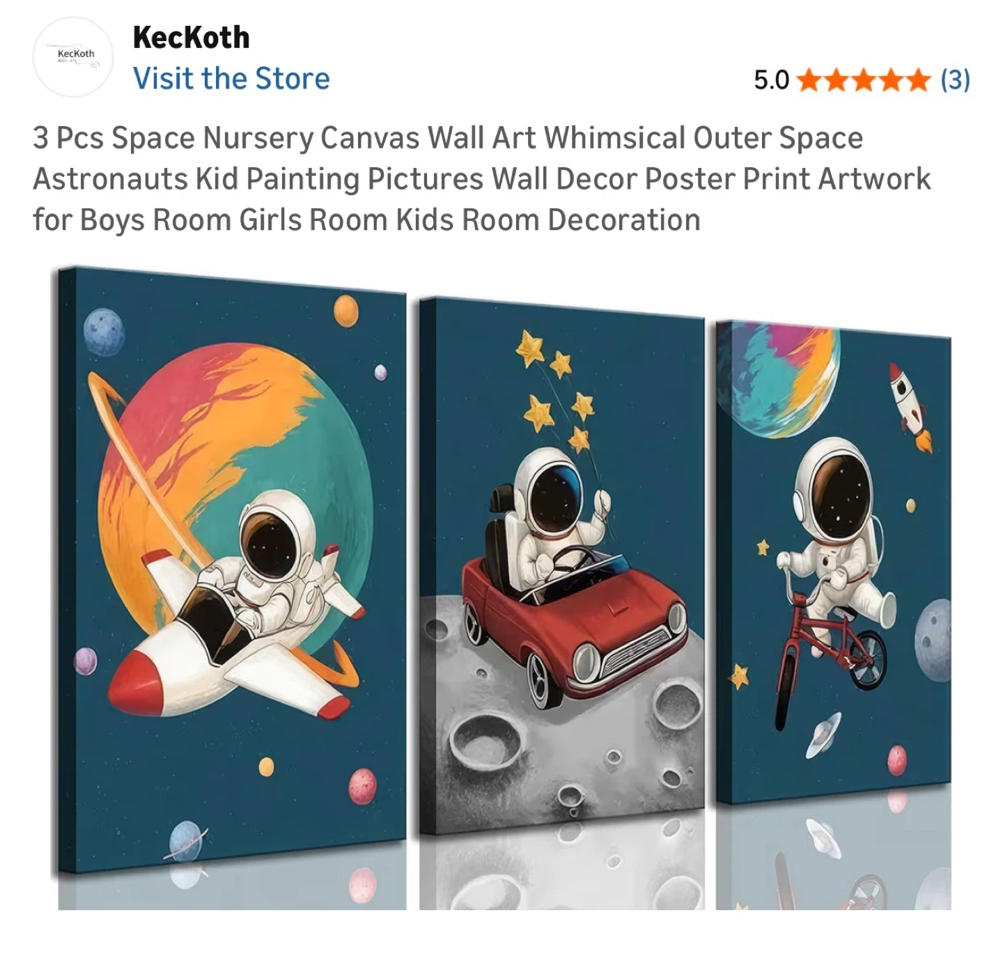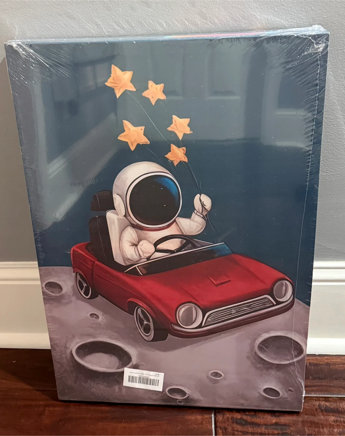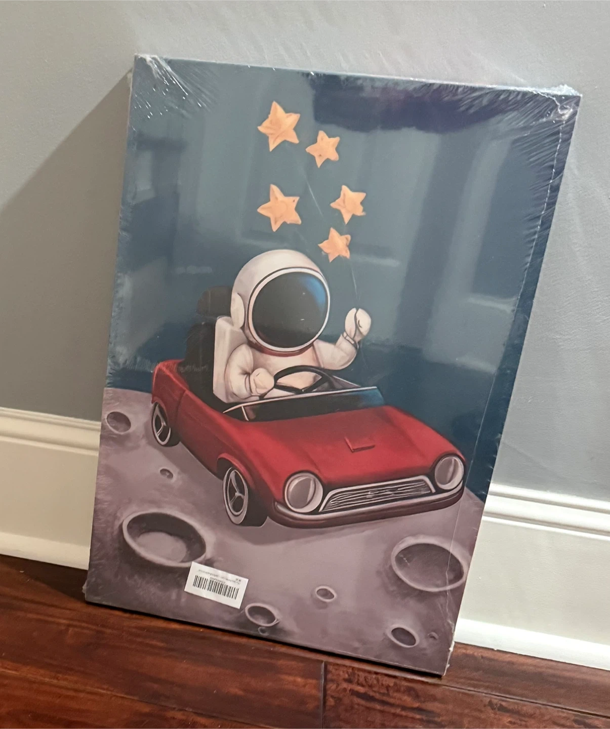 This is a set of three canvas wall art prints featuring astronauts in space. Each panel has a unique design with vibrant colors and playful imagery. It's a fun addition to a child's room or any space-themed decor!