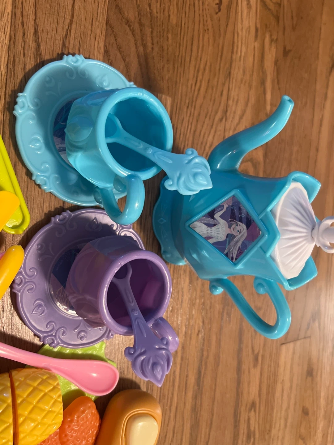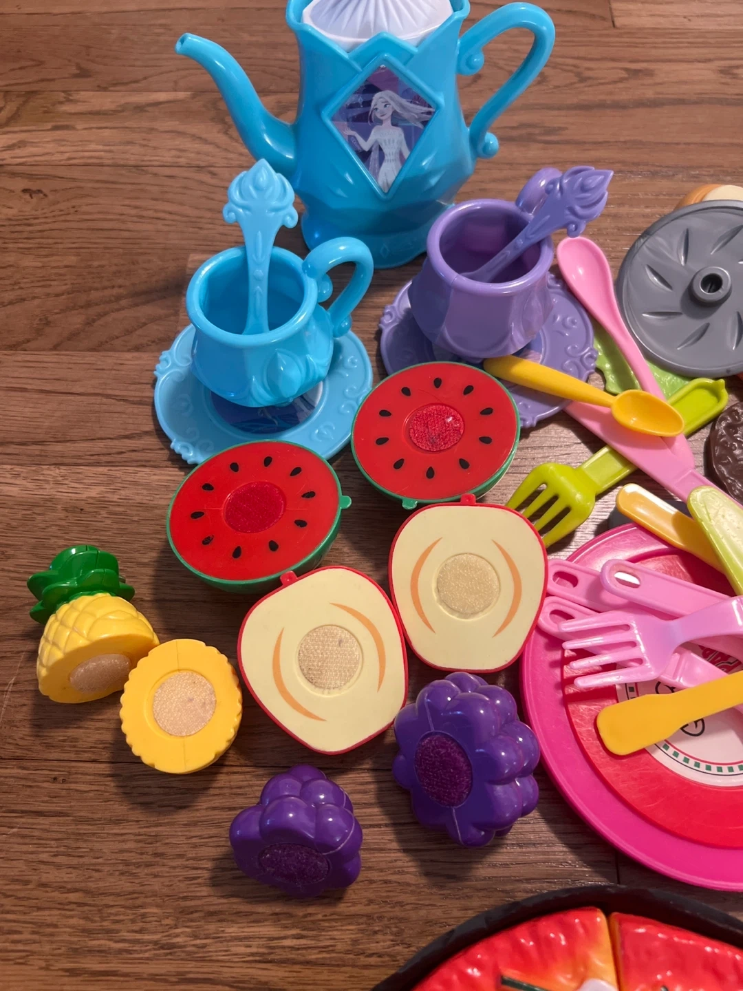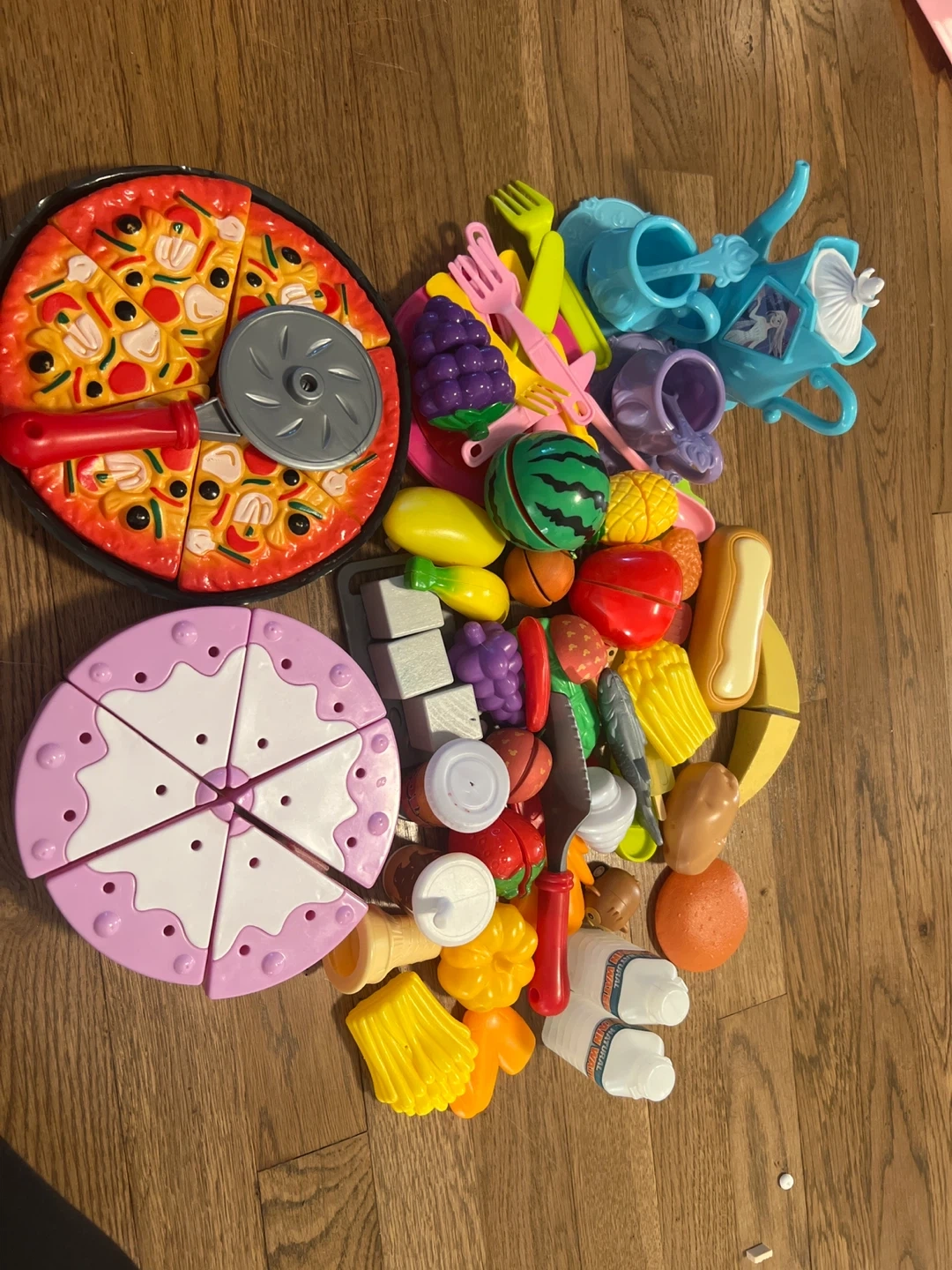 This play food set includes a pretend pizza and cake, various fruits, and a tea set with cups and a teapot. It also comes with plastic cutlery and other accessories for imaginative play. It's perfect for children who love to pretend they're cooking or hosting a tea party!