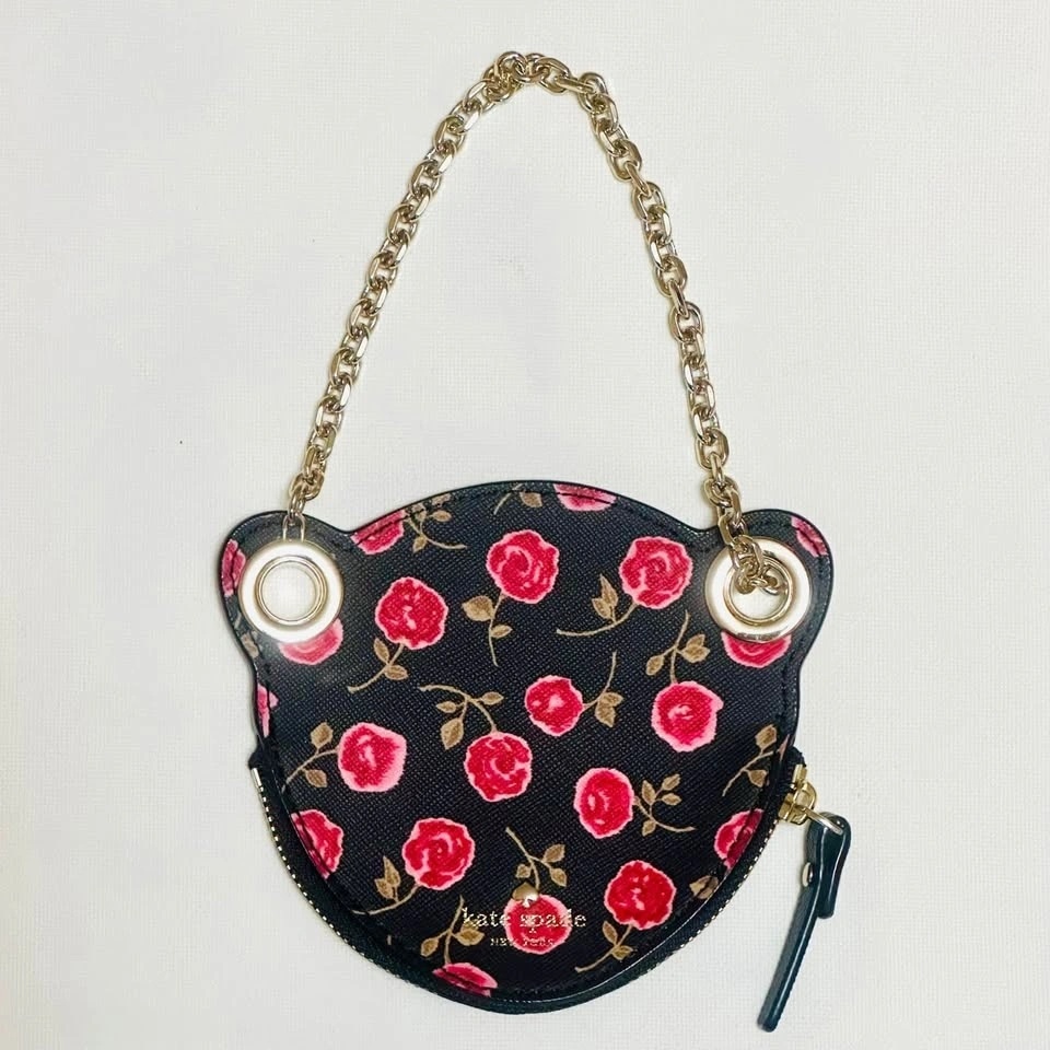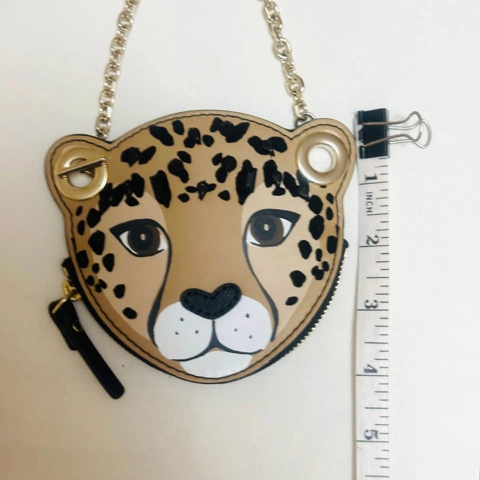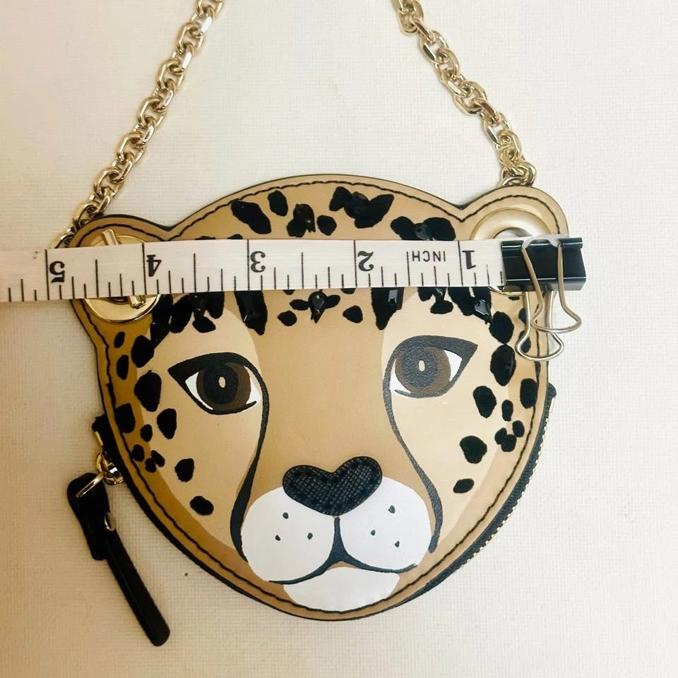 Elegant wristlet with leopard on one side and red floral pattern on the other. Gold chain strap adds sophistication. Excellent condition. Measurements in photos.