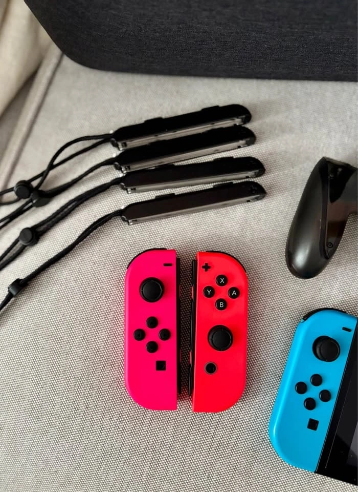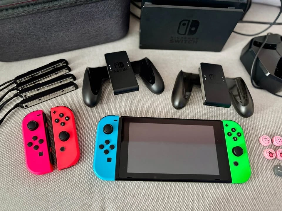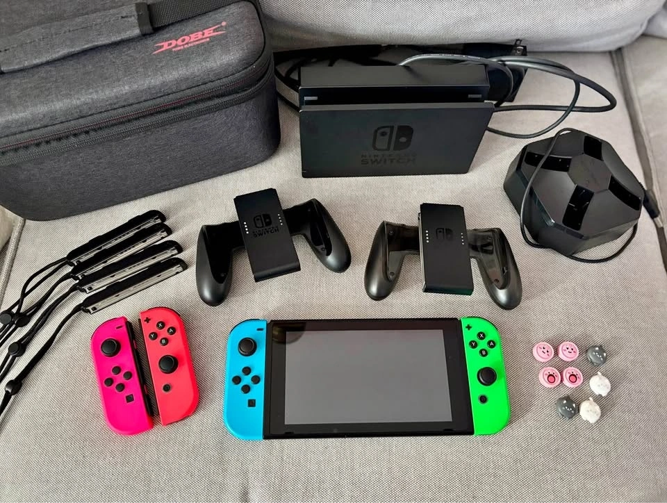 Original Nintendo Switch with multiple accessories and a case that fits both the console & dock. The case is technically for the Switch 2, so you can continue to use it if you upgrade in the future. Accessories include: protective case with removable strap, red game card holder, 4 Joy-Cons, 4 Joy-Con wrist straps, 2 Joy-Con grips (one is a charging grip!), Joy-Con charging dock (charges all 4 at once), and 8 Joy-Con rubber grips (Kirby & Cats designs). Console has been reset to factory settings. Pick up at Broadview and Danforth in Toronto.