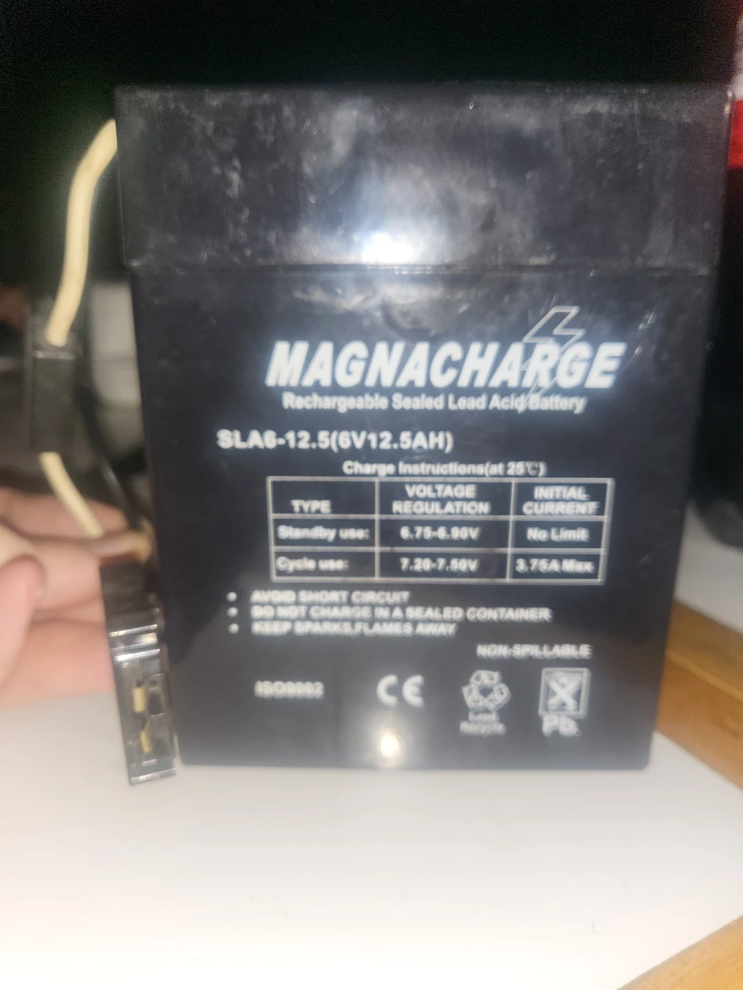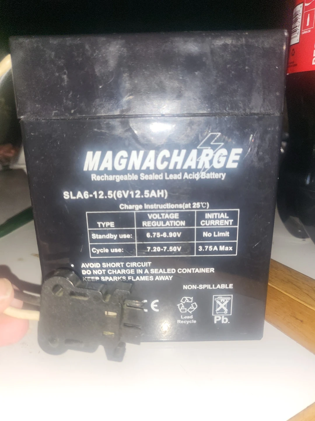 Magnacharge rechargeable sealed lead acid battery. Model SLA6-12.5 with 6 volts and 12.5 amp hours. Standby voltage is 6.75-6.90V and cycle use is 7.20-7.50V.