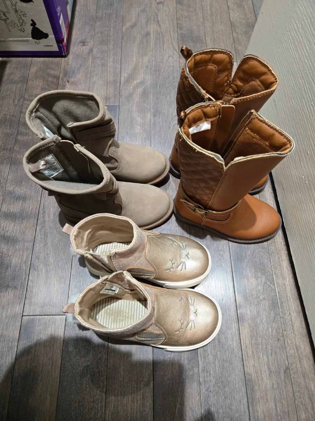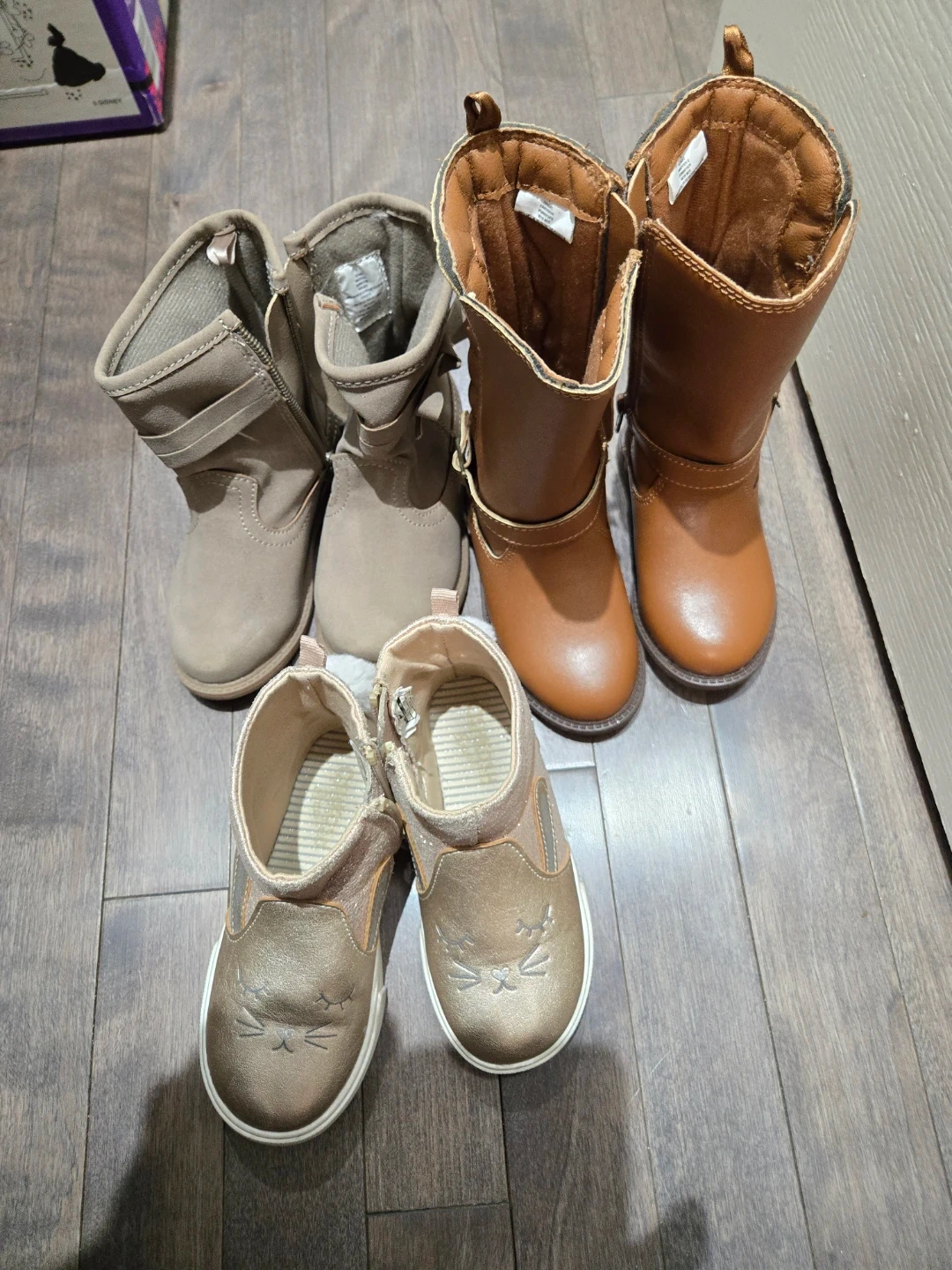 Bundle of three pairs of toddler girls' footwear. Includes two pairs of boots in brown and taupe, and one pair of rose gold slip-on shoes with cat faces. Boots feature zippers for easy on and off. Shoes are a size 6, 7 and 8. 2 boots are new.