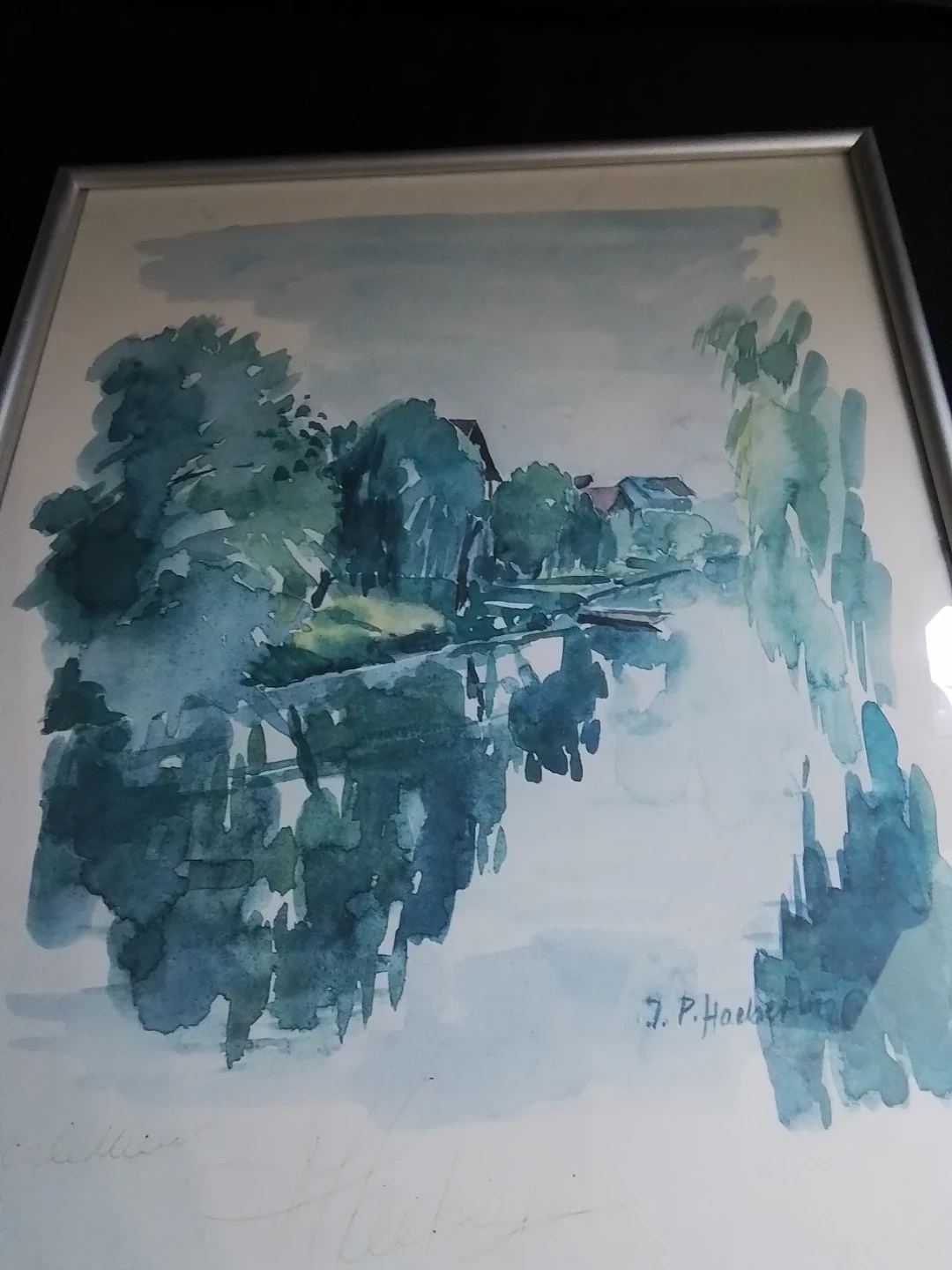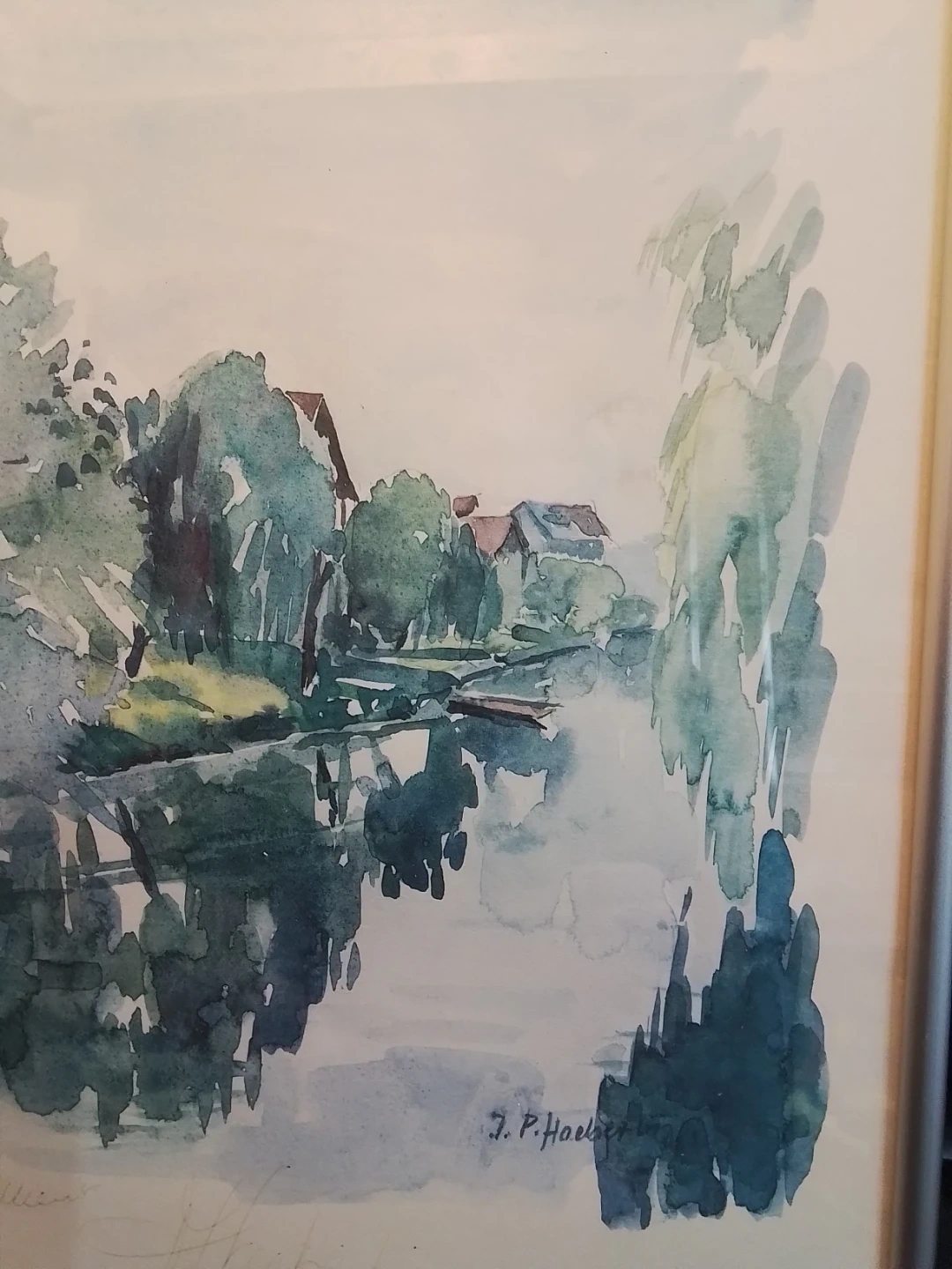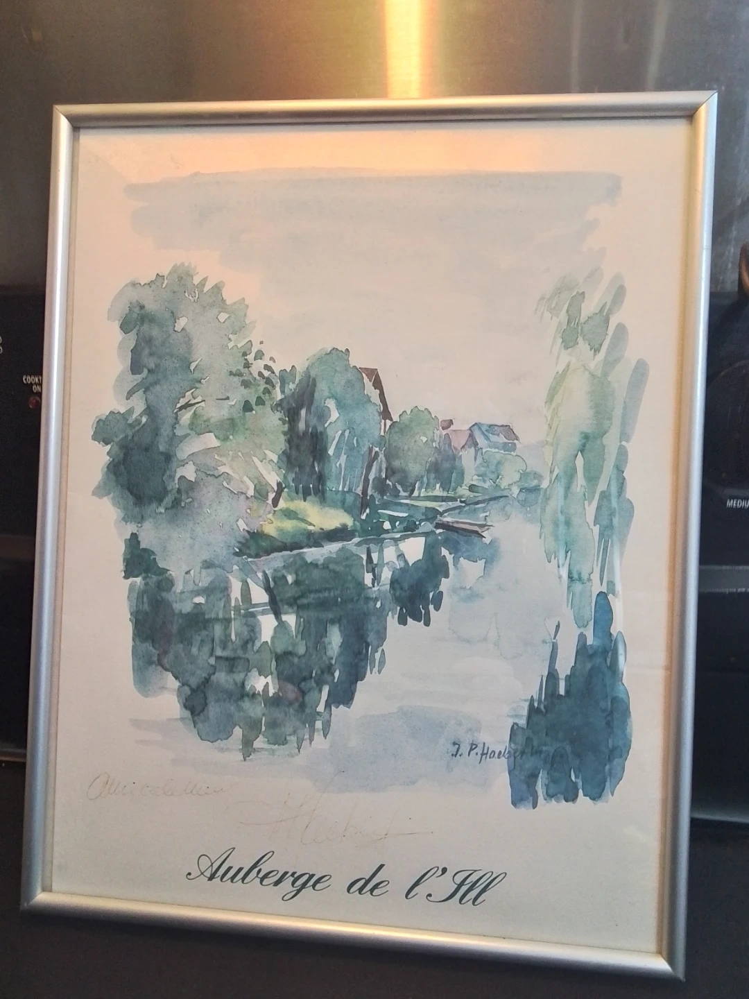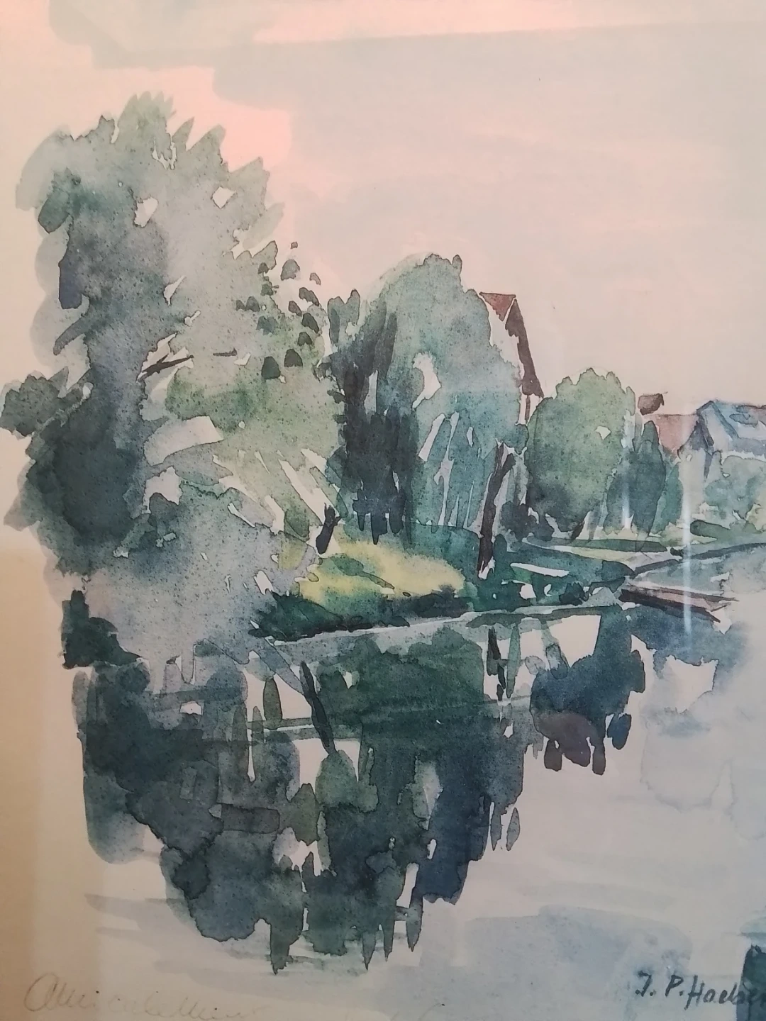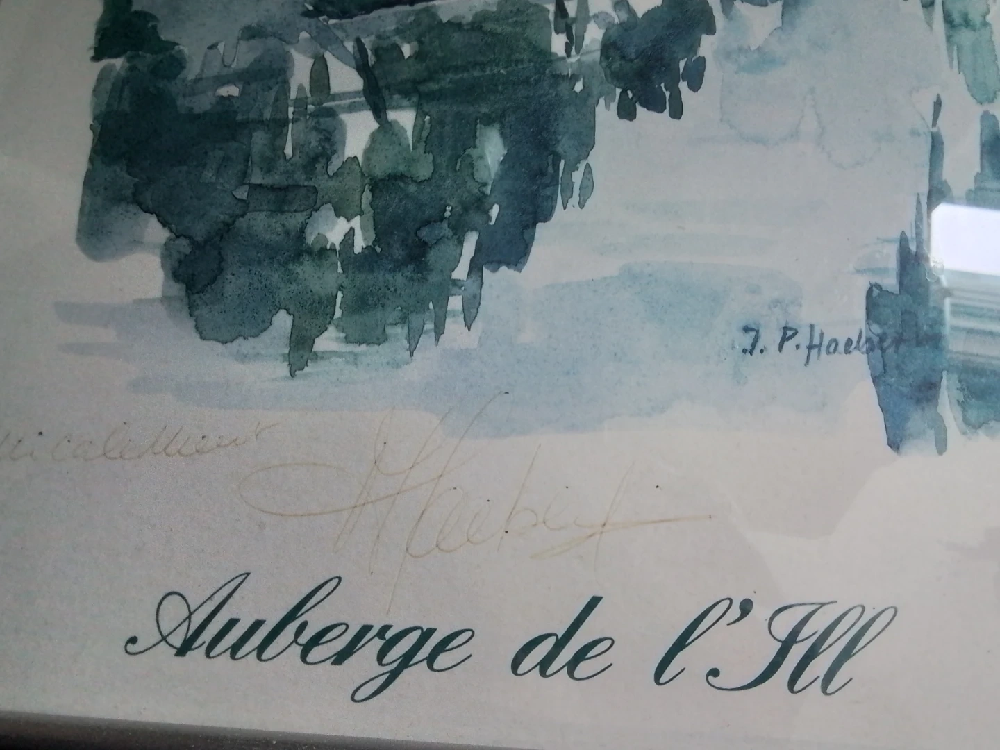 Original watercolour painting titled "Auberge de l'Ill" by J. P. Haeberlin. Features a serene lakeside scene with trees and buildings reflected in the water. Framed for display.