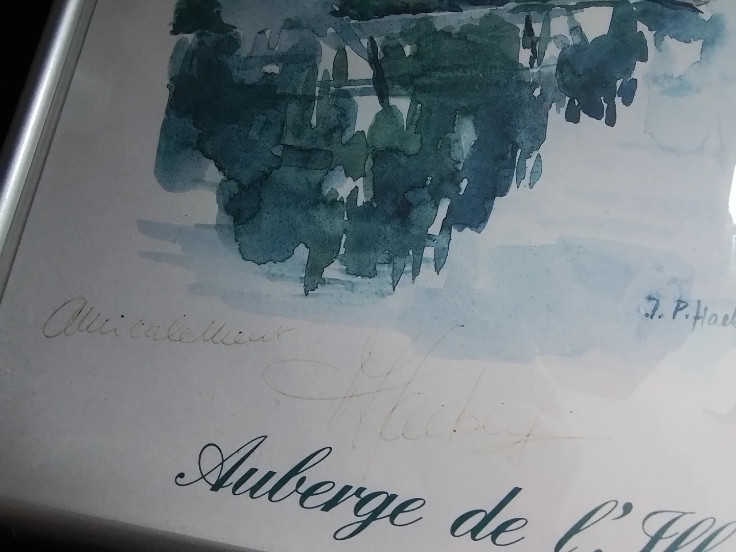 I am offering a beautiful watercolor painting by J.P. Hoeckler titled 'Auberge de l'Ill'. The artwork captures a serene waterside scene and is signed by the artist. This piece measures 11.25x14.25 inches and comes framed, ready to hang and enhance any room. The condition of the painting is Exellent with no visible damage to the artwork itself.