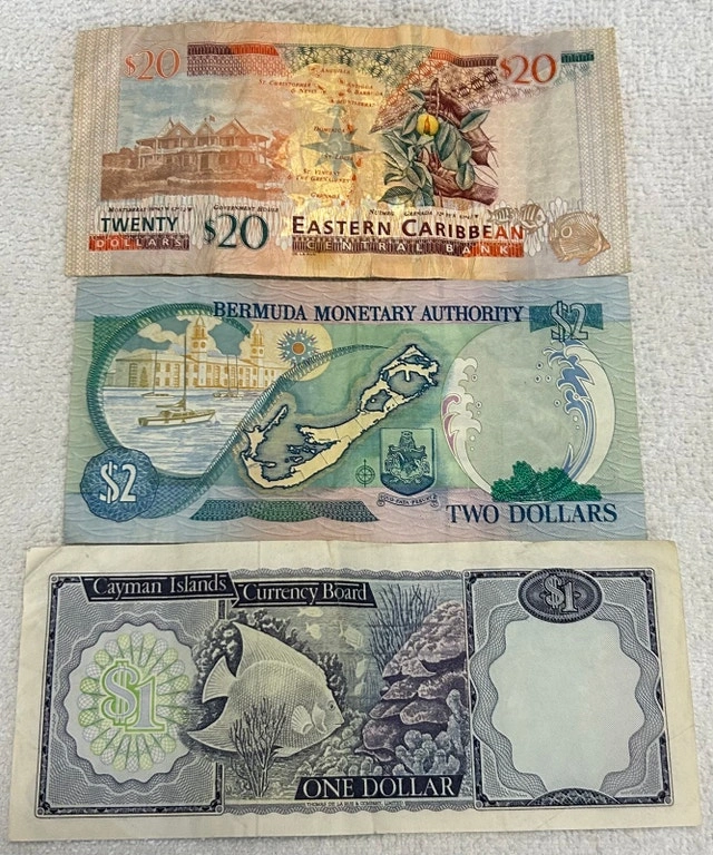 Offering a collection of circulated world currency, including a 20 Eastern Caribbean dollar note, a 2 Bermuda dollar note, and a 1 Cayman Islands dollar note. These notes have been previously owned but are in good condition for collectors. A fun way to own a piece of the world! If the ad is up, it's still available.
