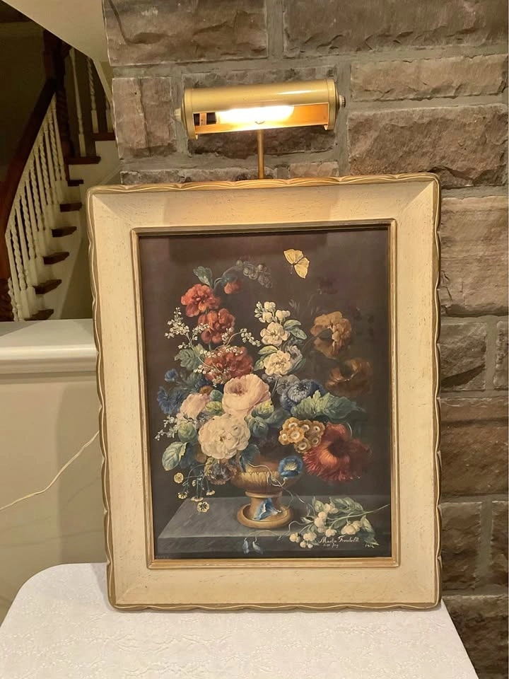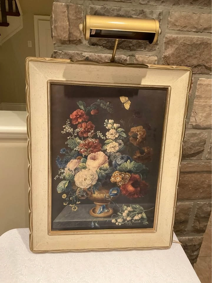 Beautiful reproduction "Summer Bouquet" of an 1802 painting by Martin Fromhold. Comes on a handmade frame. Dimensions are 23 1/2 " x 19 1/2 ". The frame and print are in pristine condition. Includes a brass-tone original picture light over the print, which can be removed. Limited edition #237/2800. From a smoke & pet-free home. Cash only. Located in Richmond Hill (Bathurst & King Rd).