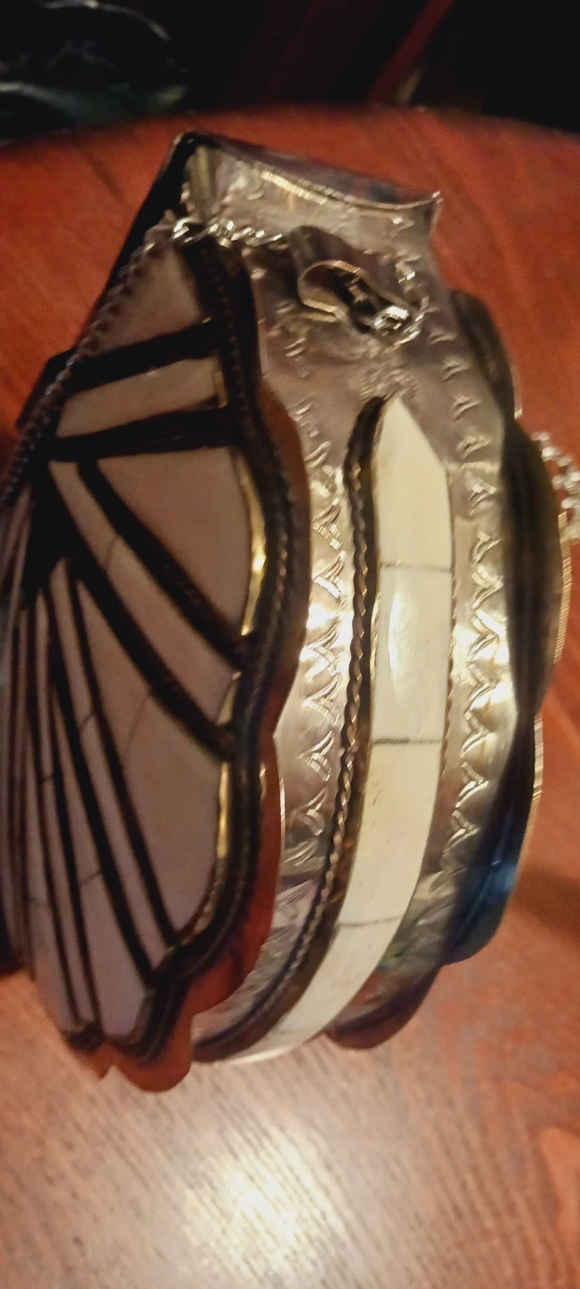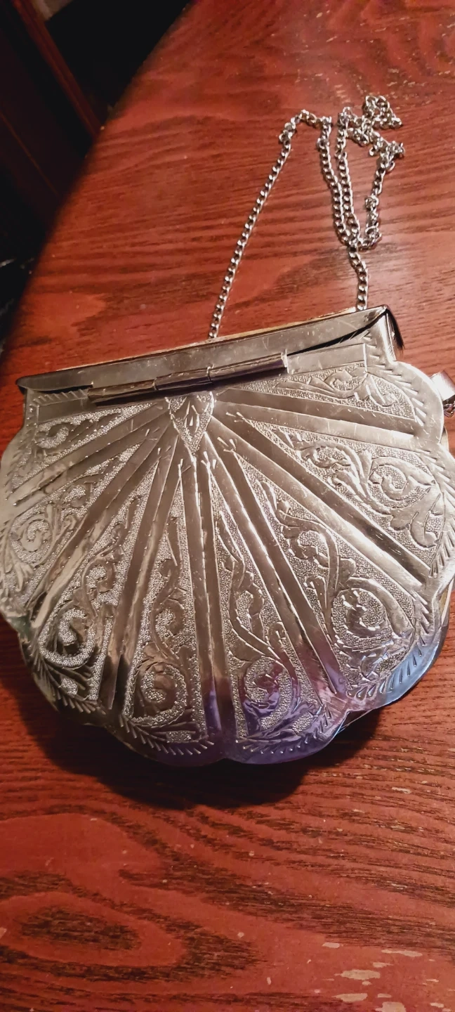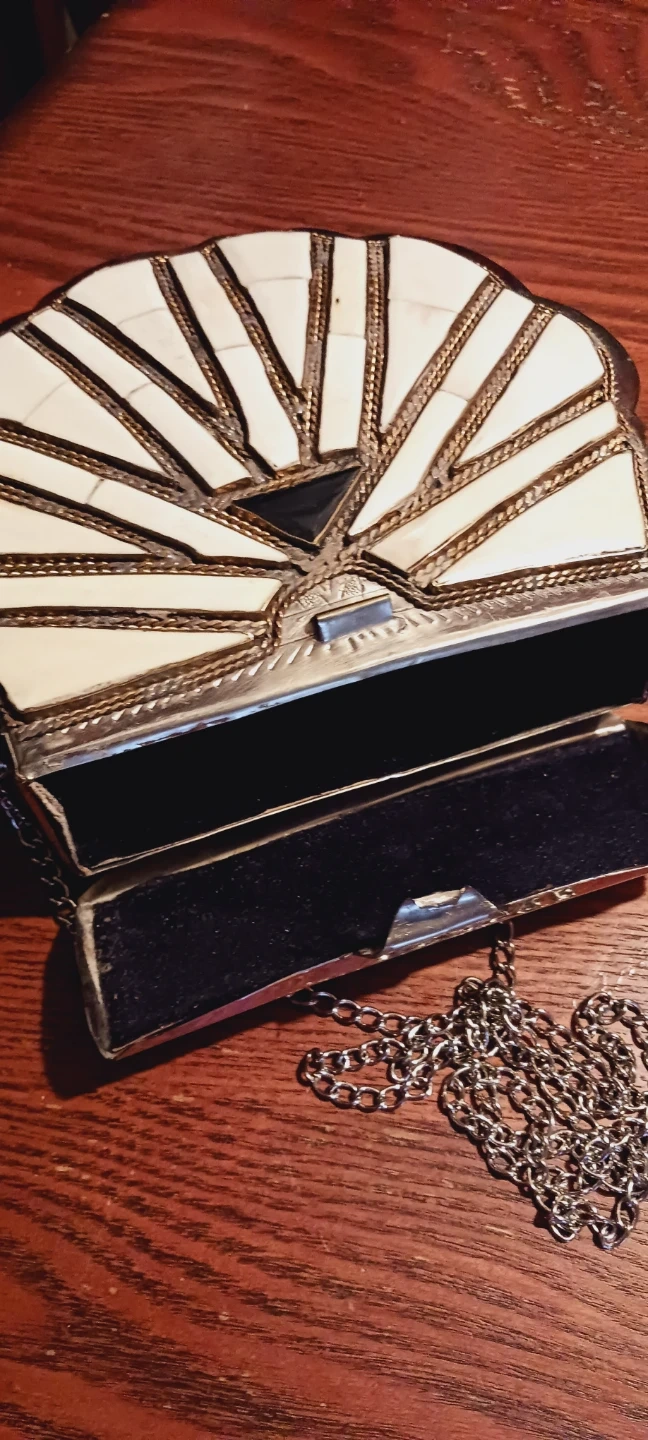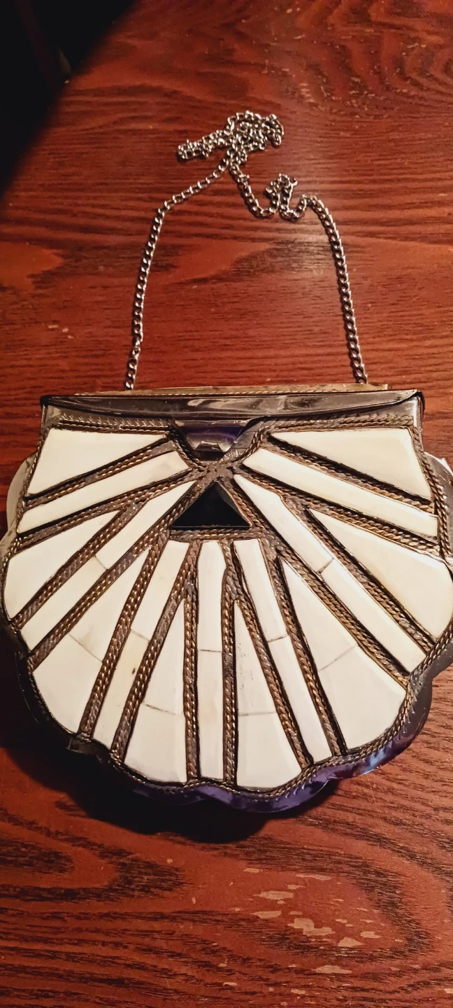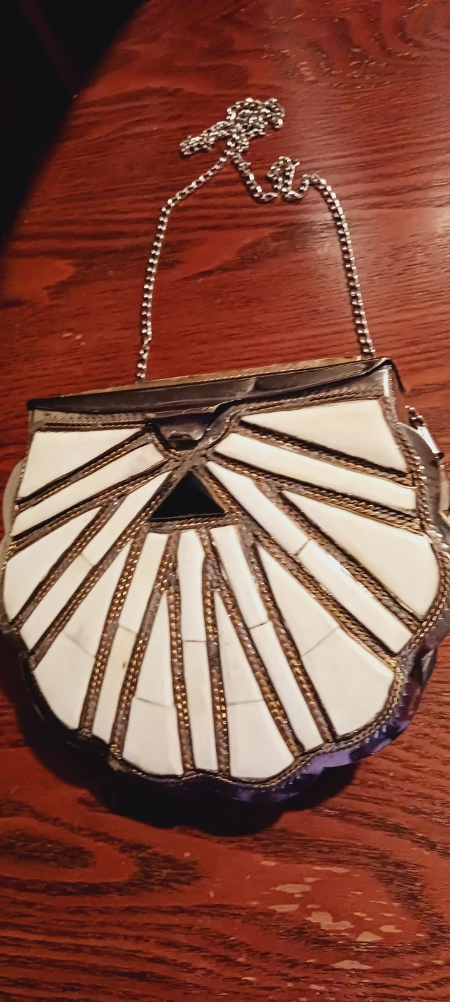 Gorgeous Vintage Morrocan Handcrafted Stone Inlaid Metal Purse with a Chain. It features white and gold detailing on the front, with a silver-tone metal frame and chain strap. The interior is lined with black velvet. The size of the purse itself is 8"×7" and with the chain is 25" long. Excellent condition. ALL MY PRICES ARE NEGOTIABLE !!!