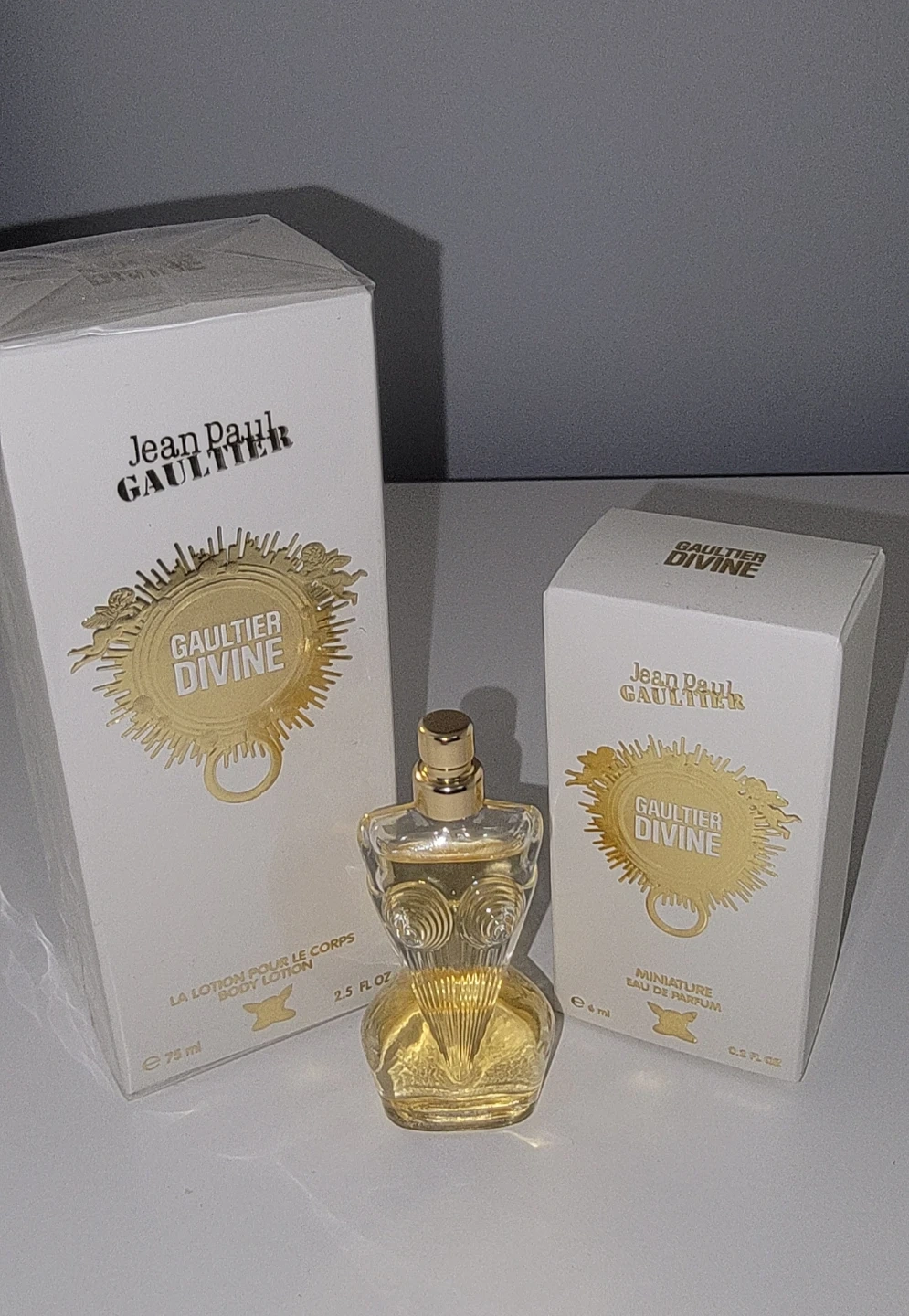 Selling a set of Jean Paul Gaultier Divine perfume and body lotion! The body lotion is 75ml and the perfume is a miniature size.