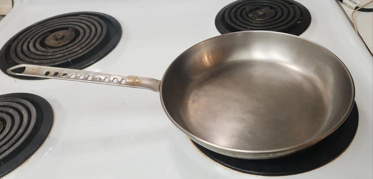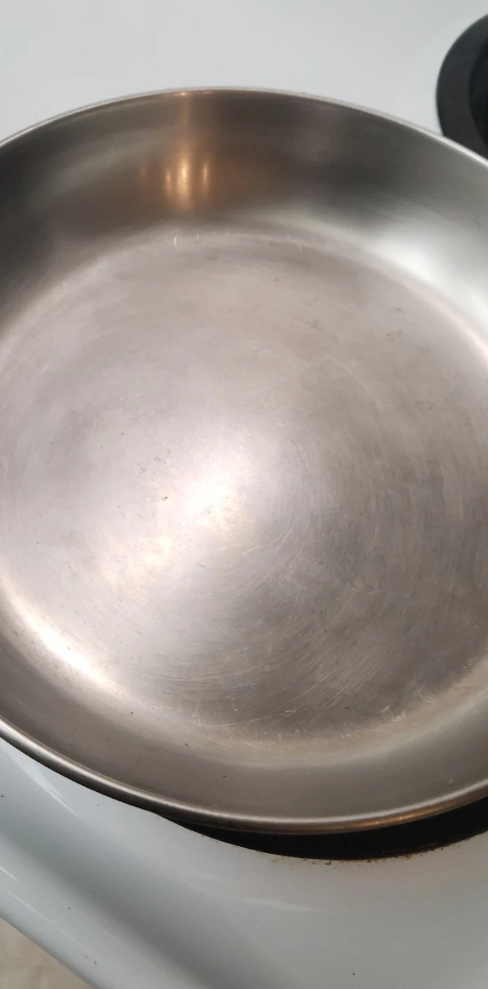 A classic stainless steel frying pan. It's suitable for everyday cooking tasks. Measures approximately 10 inches in diameter.