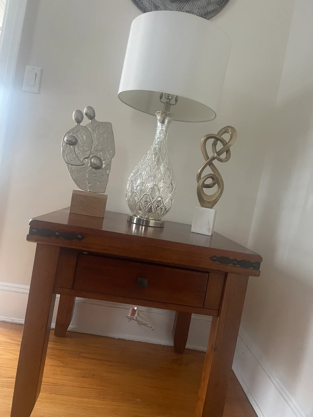 Selling a table lamp with a decorative glass base and white lampshade, along with two decorative sculptures. One sculpture is silver and depicts a family, while the other is a gold-colored abstract design on a white base. They would be a great addition to any room!