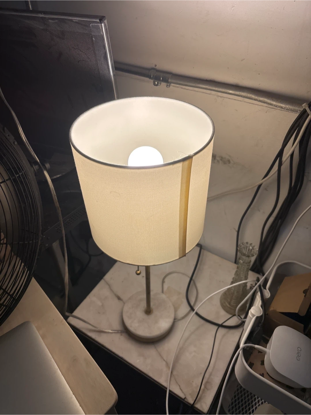 10This is a simple table lamp with a white shade and a marble base. It gives off a nice, warm light and would look great on a nightstand or desk. It's in good condition and ready for a new home!