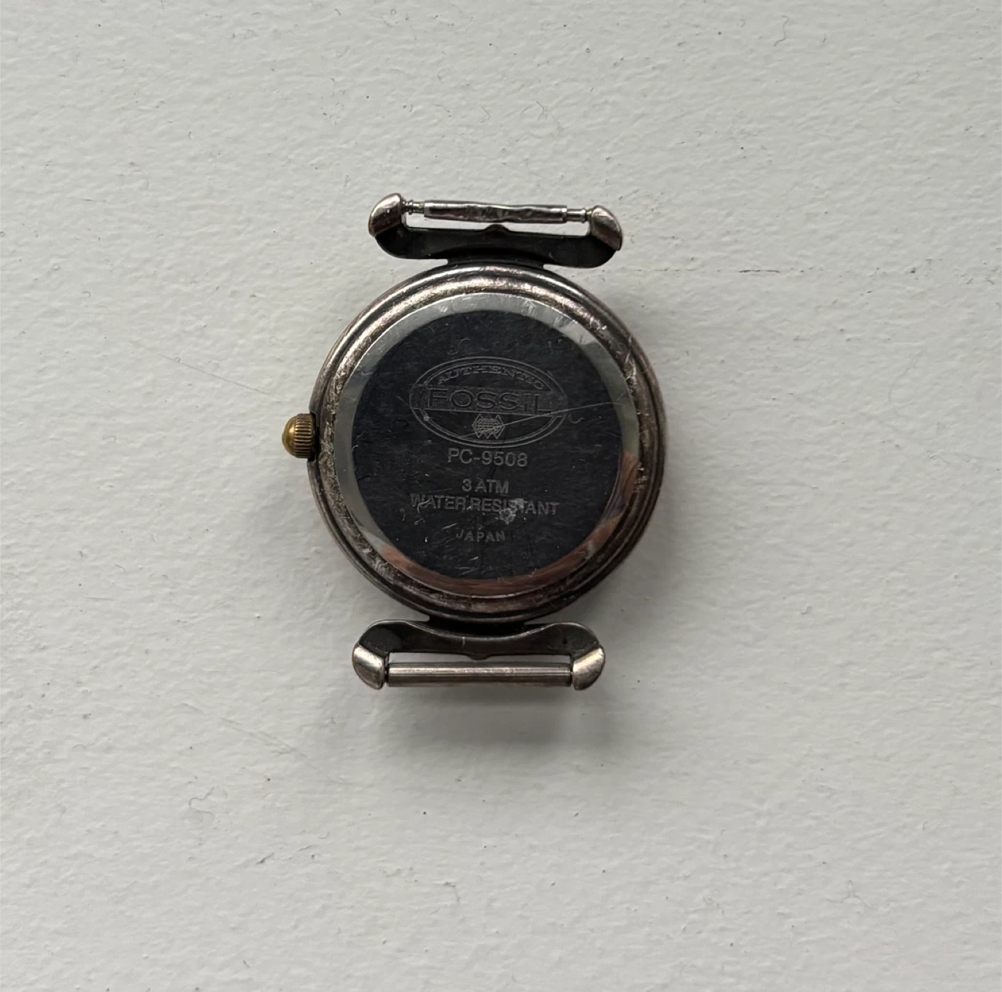 Fossil watch with a dark green face and Roman numerals. It has a date display. Metal band. Needs new battery. Doesn’t come with strap.