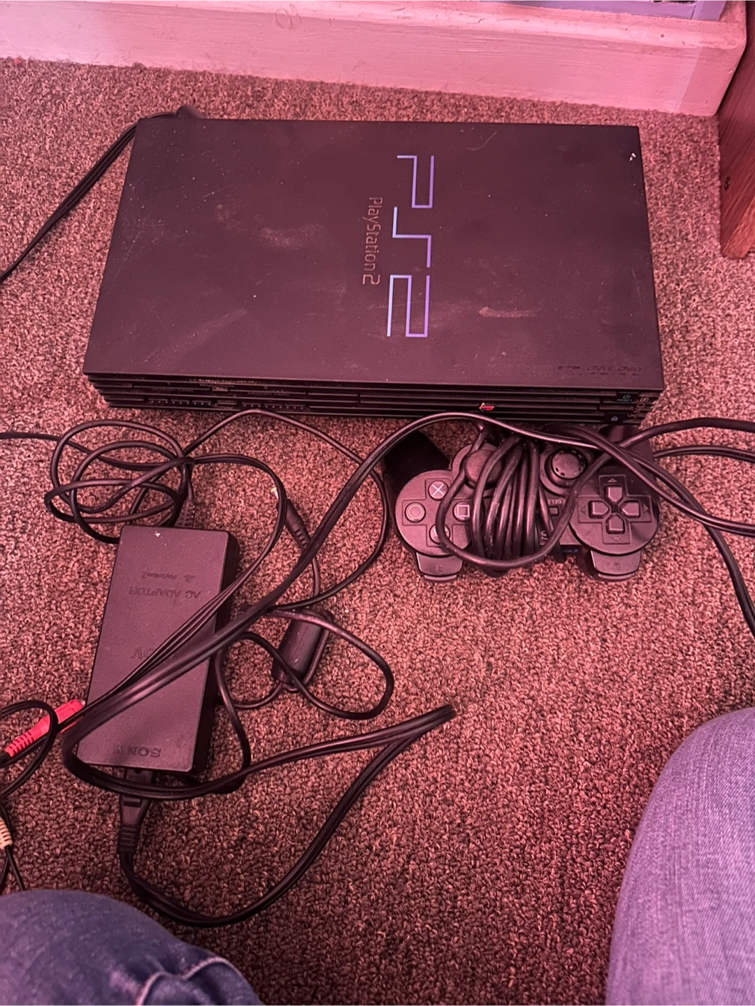 This is a Sony PlayStation 2 console. It comes with one controller and the original AC adapter. The console is black.